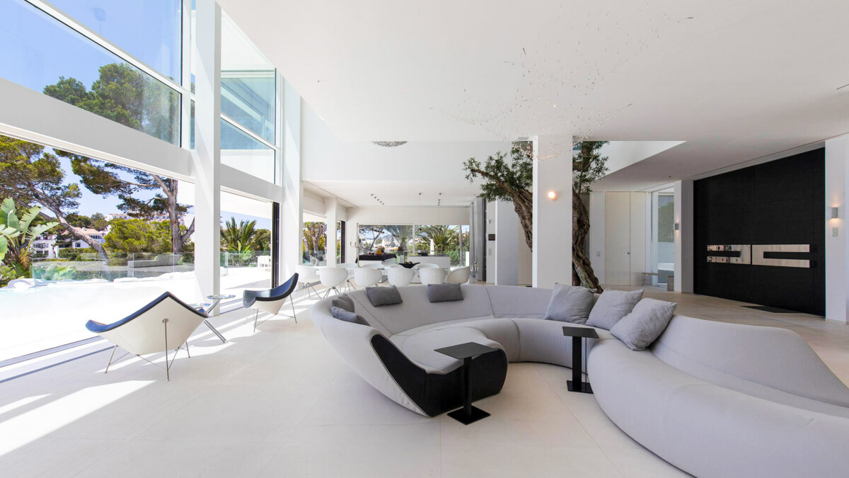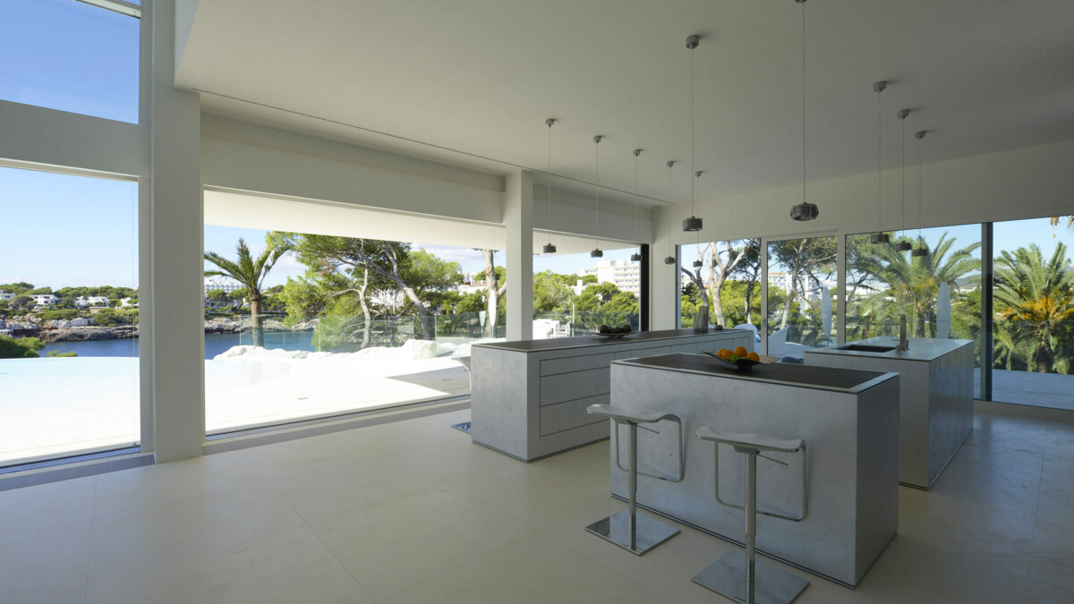Une cohérence visuelle et émotionnelle a été créée entre les espaces intérieurs et les panoramas offerts par les extérieurs. Le très grand mur vitré du salon/salle à manger (3 x 25 mètres), peut être complètement abaissé à l’aide d’un simple bouton, créant ainsi une transition étonnante vers l’espace extérieur. En plus du cinéma 3D et du salon intérieur avec billard, bar et vue imposante sur la baie maritime, la propriété dispose également d’une salle de sport avec sauna.