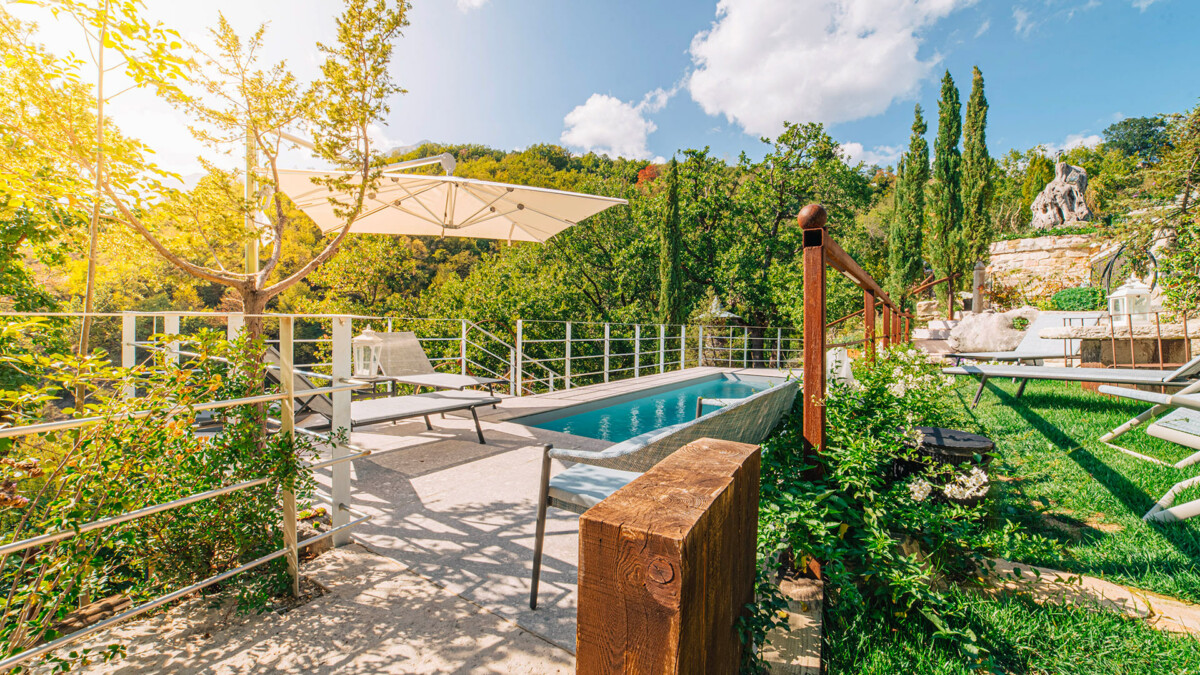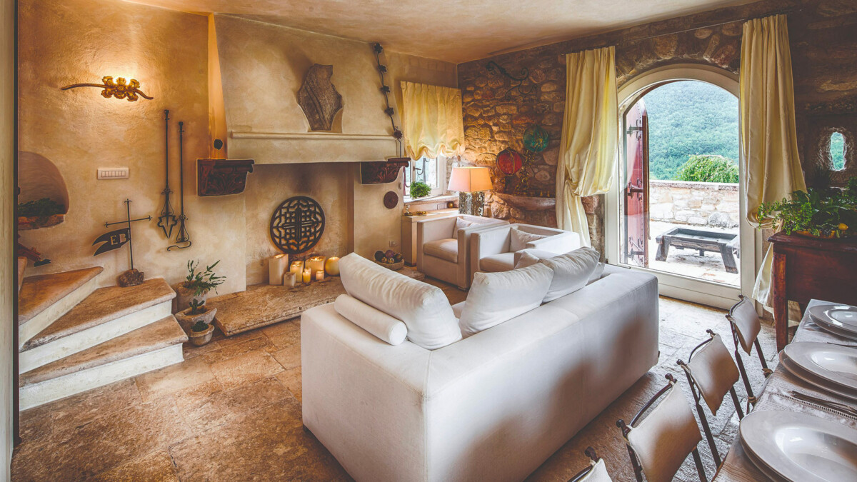 The ancient architectural elements have been restored and mashed with modern design elements to provide a sense of comfort and elegance. Located on the ground floor, this luxury suite is accessible without having to climb any steps. Guests will find a charming bedroom with a large glass door that leads directly to the garden. There is also a living room with kitchenette, which overlooks a splendid courtyard on the ground floor and a stone balcony with a view of the Infernaccio gorge and the surrounding mountains.