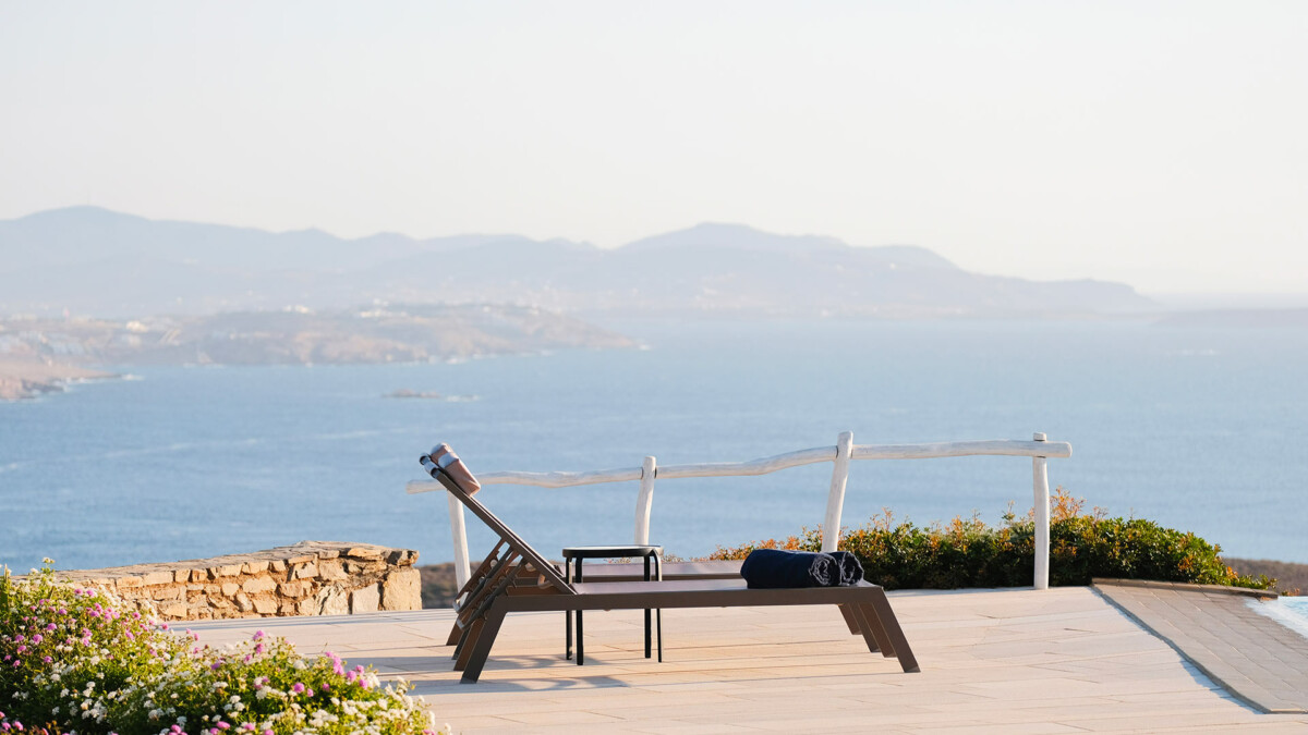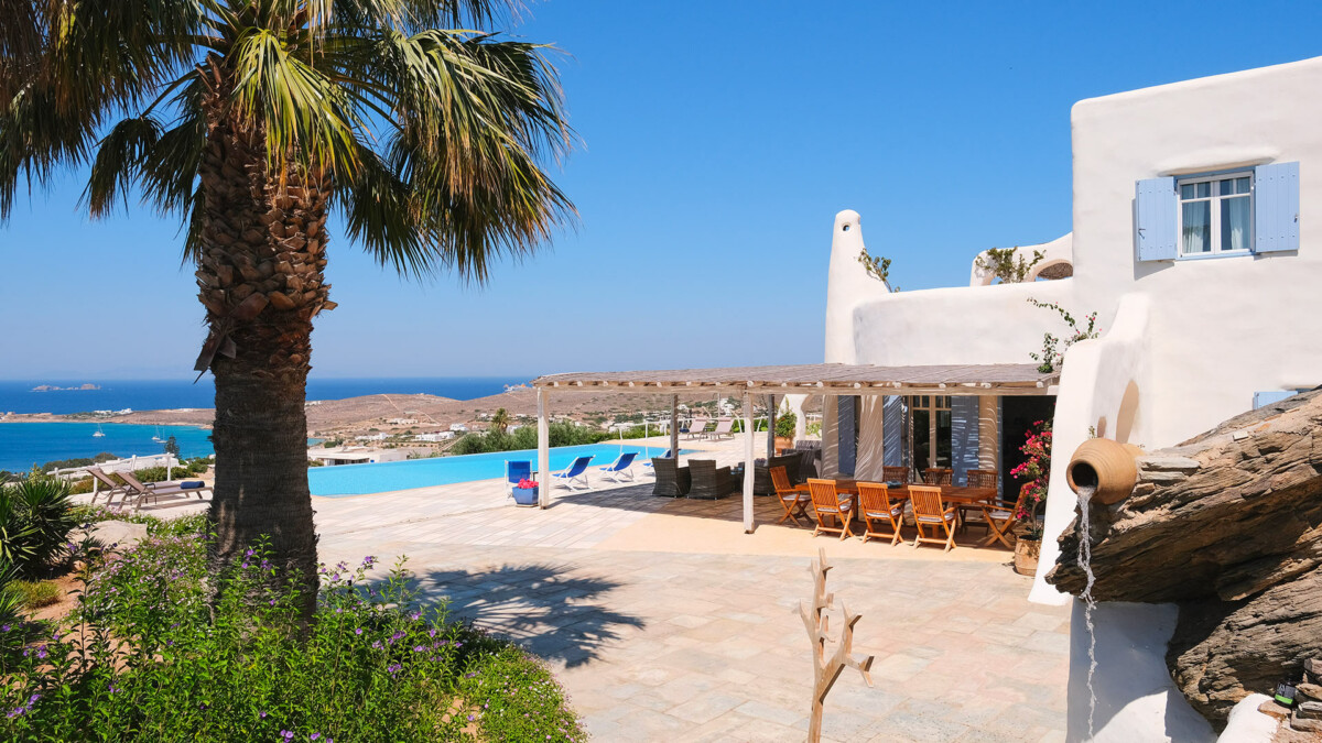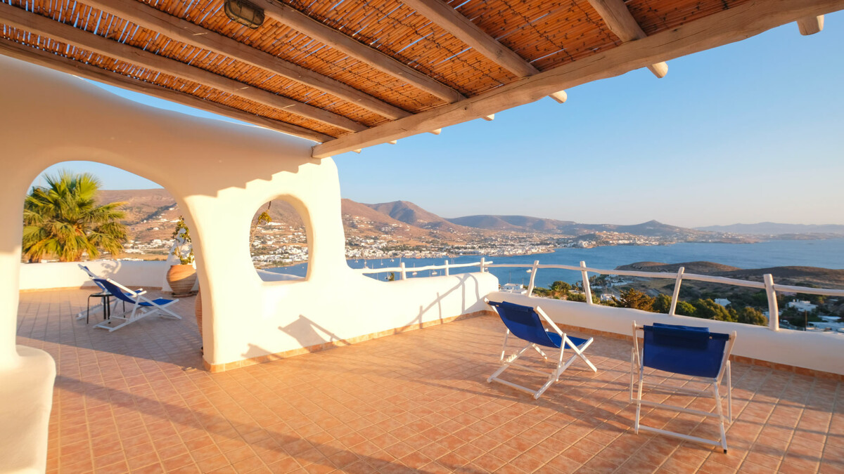 À l’extérieur, il s’agit presque d’une expérience méditative. Vous pourrez admirer le paysage magnifique qui se transforme tout au long de la journée avec la lumière qui donne des allures différentes au ciel passant du bleu à l’or puis au rouge vif, à la mer, à l’horizon, aux îles lointaines, aux villages et à la villa elle même… Le mouvement des ferries et toutes sortes de bateaux arrivant et partant de la baie de Parikia confère à la scène un aspect théâtrale.