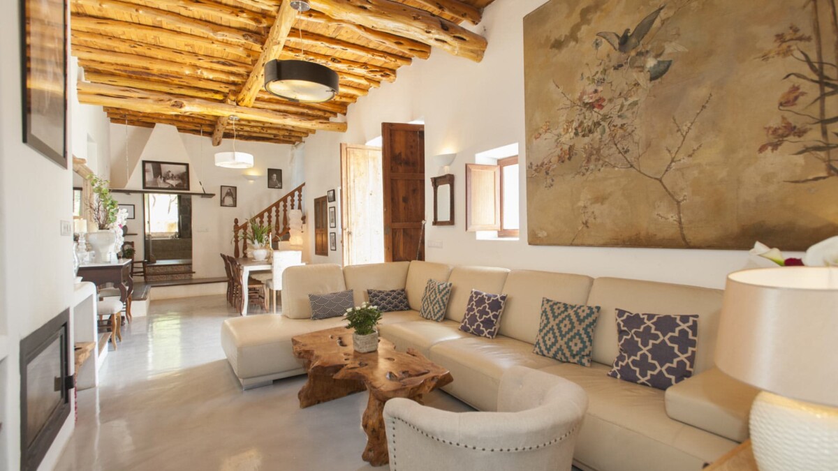 Le salon mesure 6 mètres de long, avec un plafond à poutres apparentes de 5 mètres de haut – un lieu exquis, avec une ancienne porte de 4 mètres de haut et beaucoup de caractère. Lorsque vous ouvrez les portes et laissez l’air circuler, votre journée et la baie de San Antonio sont sous le soleil. Tous les murs sont d’origine, en pierre de 3 pieds d’épaisseur et donc insonorisés, revêtus de Cal (badigeon à la chaux de manière traditionnelle); les poutres en bois dur au-dessus sont sabina et olive, enduites d’huile de lin; tous les produits sont achetés localement. Le sol est un ciment simple et traditionnel.