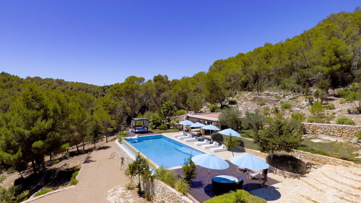 L’emplacement est extrêmement privé; près du sommet d’une colline boisée, surplombant la côte ouest d’Ibiza, sans vis-à-vis, avec 12 hectares de terrain, entourés par la nature.