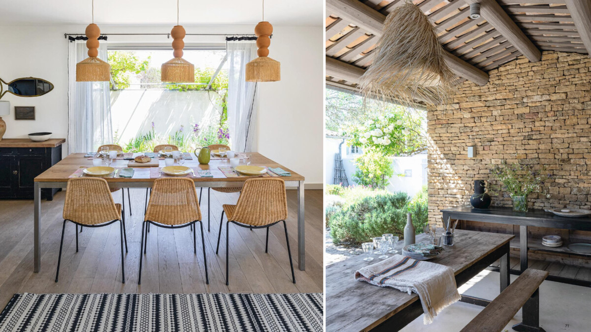 Un auvent en pierre permet d’abriter la charmant espace repas d’été.