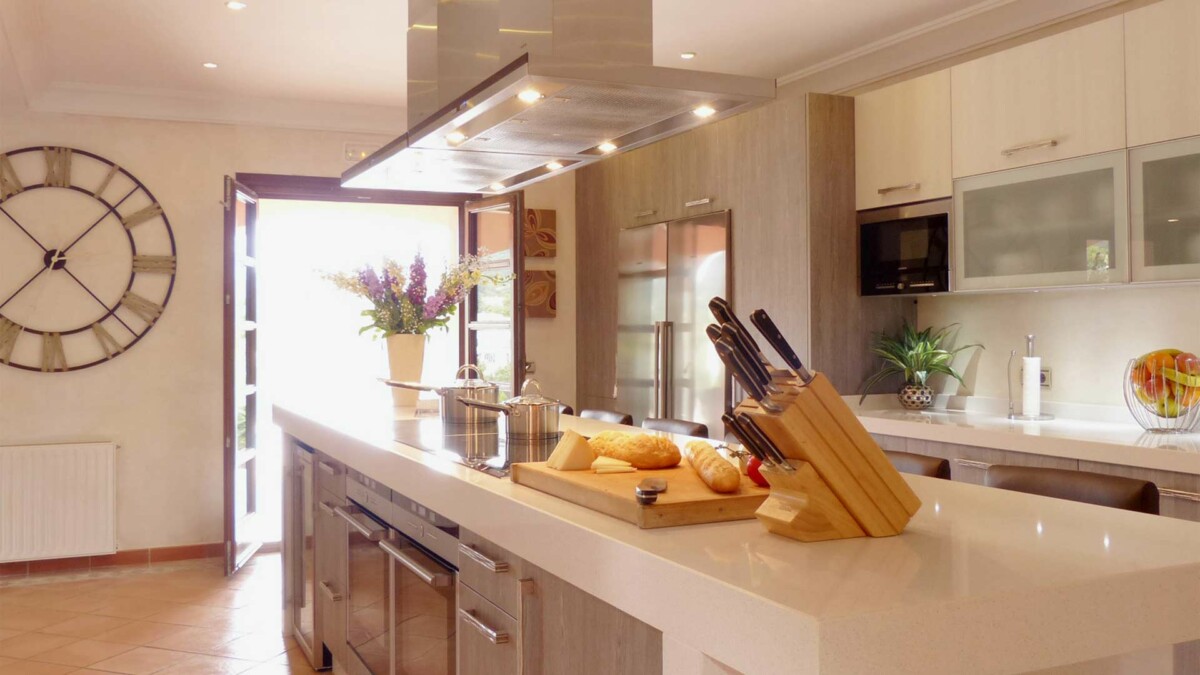 From the lounge and the newly installed professional kitchen on the ground floor, as well as one of the bedrooms, you have direct access to a large free-form swimming pool and terrace areas, all offering you stunning panoramic views. Dine al fresco and enjoy a poolside candle-light dinner or mouth-watering BBQ in the covered dining area on the villa’s terrace. An outdoor professional stainless steel gas barbecue (gas included) awaits the biggest of grill aficionados on the terrace level.