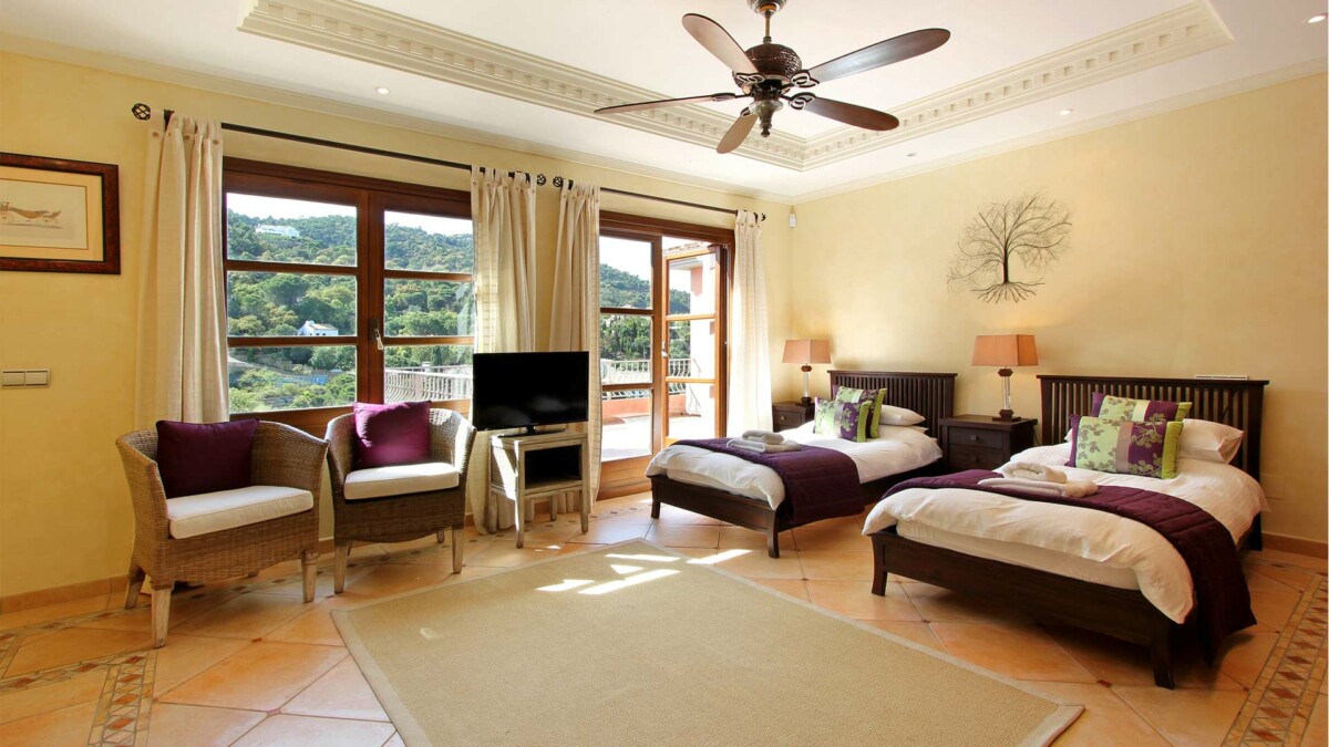 – Bedroom 3: First Floor – Two twin/single bed with large luxury ensuite featuring Italian marble, large walk-in rain & rail shower, double-ended bath tub, access to private terrace overlooking gardens and pool with panoramic views.