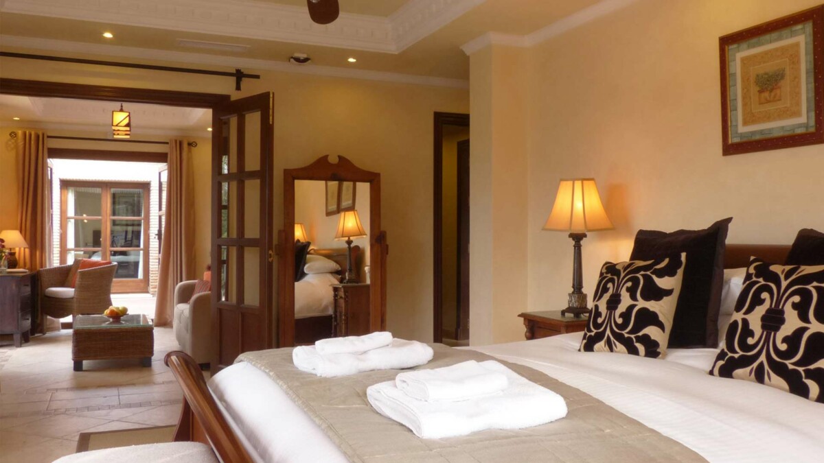 – Bedroom 5: Terrace level – Twin/two single beds with large luxury ensuite featuring Italian marble, large walk-in shower, separate bath, access to terrace overlooking gardens and pool with panoramic views. *This room can also be configured with 3 single beds.