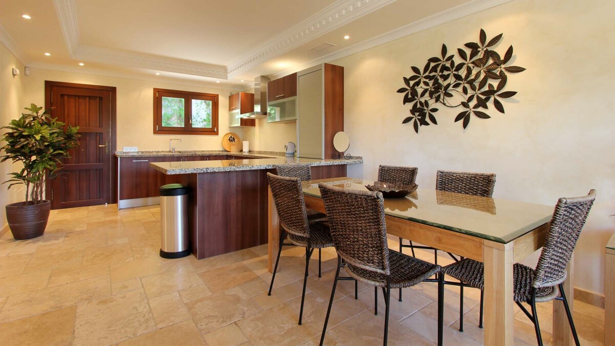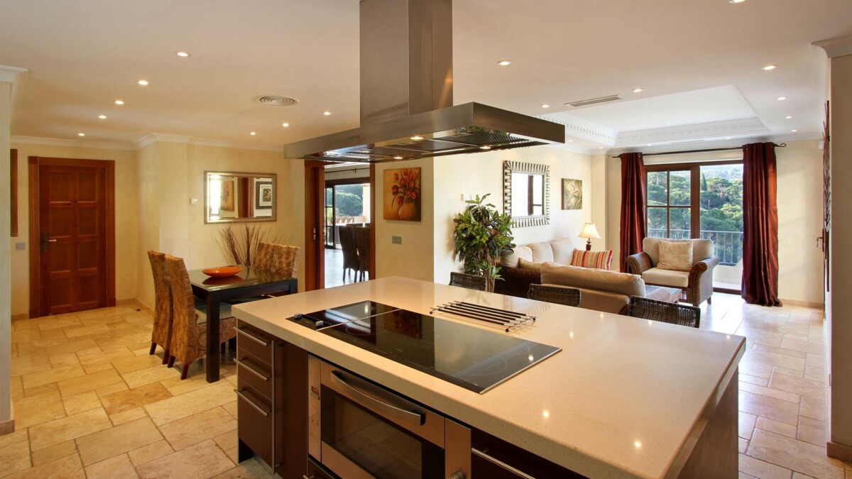 Entering the villa through the stunning 6m high Andalusian archway, you immediately realise you have arrived to a very special property. From the archway, you transition beautifully into the light and airy 14m living room, which is the centrepiece of the villa. With a magnificent 6m high vaulted ceiling, and full-width sliding glass doors, you feel as though the sweeping panoramic mountain views have been ushered right inside to where you and your guests stand. It is truly a spectacular room, designed to inspire and connect you with the surrounding landscape, whilst making you feel at home.