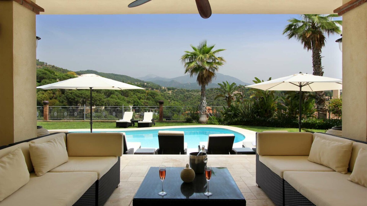 – Luxury rattan sun loungers and outdoor sofas with soft-padded cushions and parasols.