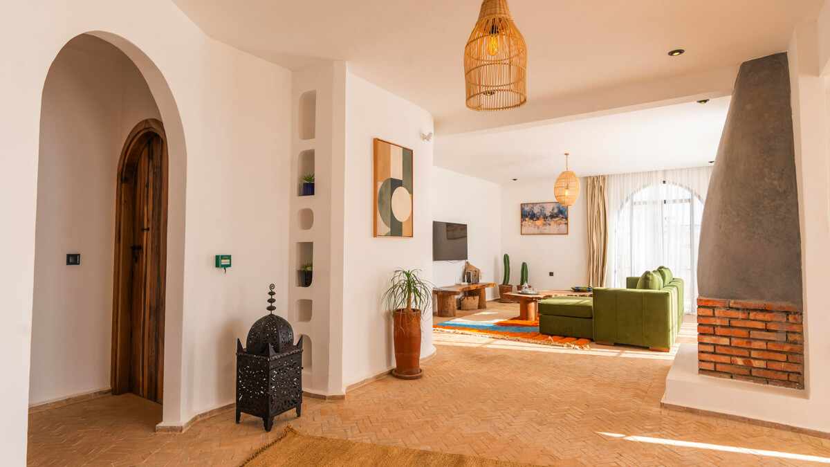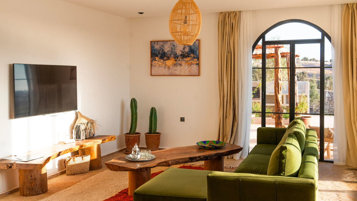 Les intérieurs de la villa révèlent une élégance discrète et un souci du détail. Le salon spacieux, baigné de lumière naturelle, invite à la détente avec ses meubles contemporains parfaitement assortis au cadre paisible. Un tadelakt traditionnel confère une texture unique aux murs, offrant un contraste harmonieux avec la menuiserie moderne. La cuisine extérieure, un espace de rassemblement convivial, surplombe la piscine et les champs d’oliviers, créant une atmosphère idéale pour des repas en plein air.