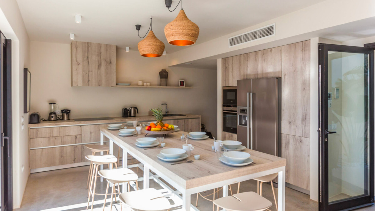 Cuisinière d’induction, four électrique, microondes, lave-vaisselle, frigo américain avec congélateur, deuxième petit frigo d’appoint, presse-fruits, cafetière Nespresso, mixeur, toasteur, bouilloire.