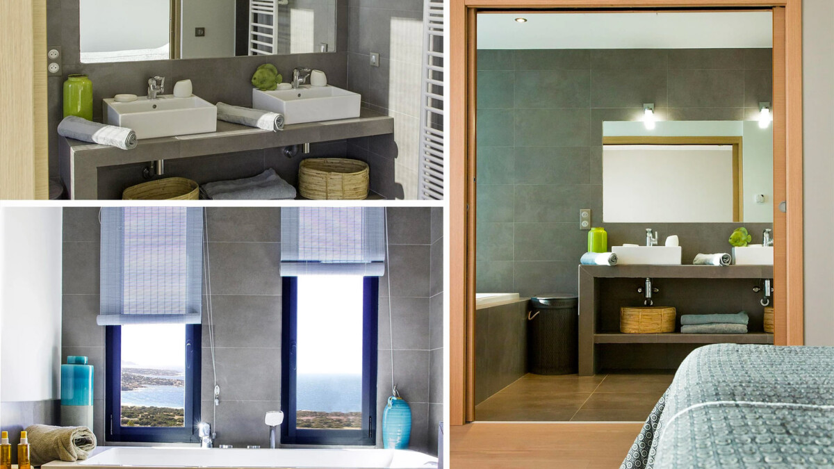 Chambre, 1er étage, vue sur la mer. La chambre propose 2 lits jumeaux 80 cm transformables en lit double. Salle de bain attenante, avec 2 vasques, douche à l’italienne. La chambre inclut également : climatisation.