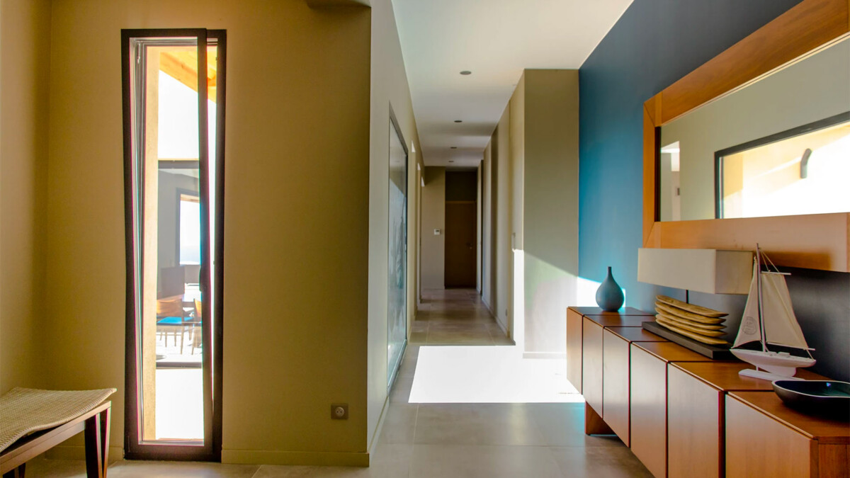 Le salon et la salle à manger, vastes pièces au mobilier de qualité en bois exotique, offrent un panorama somptueux, avec de larges baies vitrées. La cheminée en insert, invite à la lecture aux premières fraîcheurs. La cuisine, totalement équipée, s’ouvre à la fois sur le salon, sur la salle à manger et sur la terrasse protégée de pergolas. Les 5 chambres de la demeure dont l’agencement privilégie parfaitement le confort et l’indépendance de chacun sont spacieuses et élégantes, entièrement dédiées au repos et les lits sont tournés vers la mer. Elles disposent toutes de salles de bains privées, de grands dressings et s’ouvrent de pleins pieds sur l’extérieur.