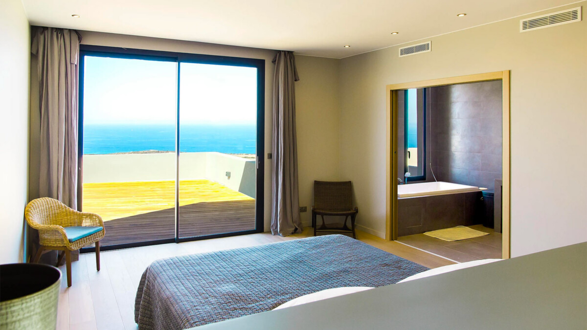 Chambre, 1er étage, vue sur la mer. La chambre propose 1 lit double King size. Salle de bain attenante, avec 2 vasques, baignoire, douche à l’italienne. WC séparés. La chambre inclut également : climatisation.