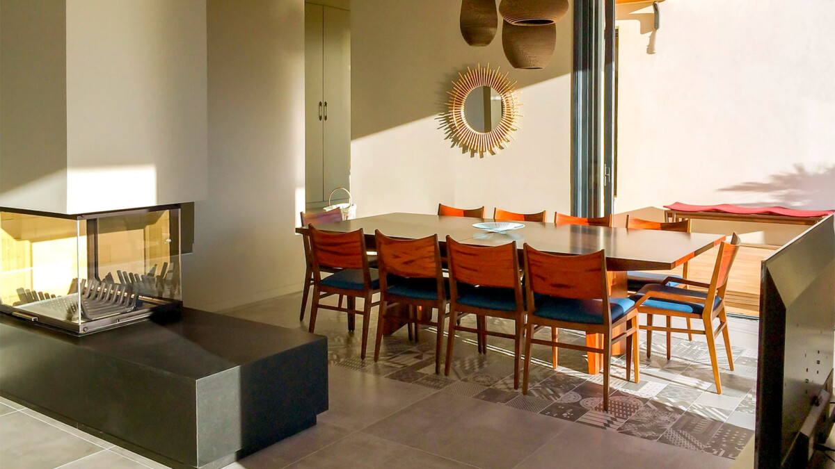 Grand espace Salon – Salle à manger avec cheminée en insert.