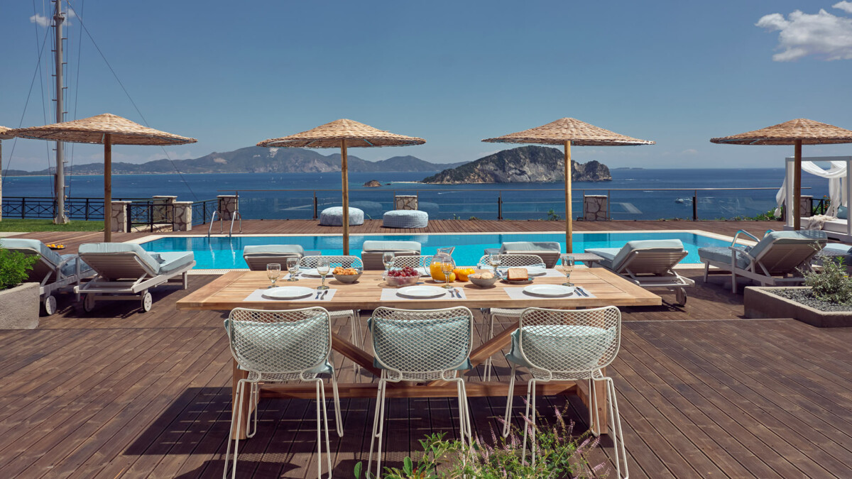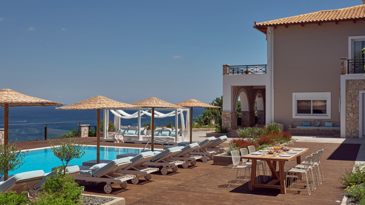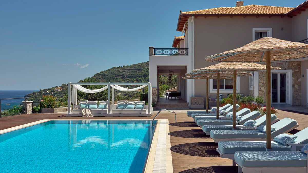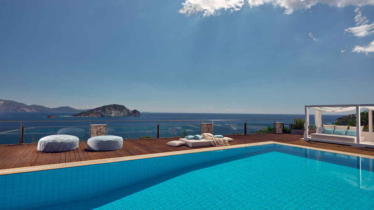 The villa, a two-story air conditioned building with elevator, has wooden floors throughout and can accommodate 12 to14  persons in 6 bedrooms. This luxury house is ideally located right by the sea in the south of the gorgeous Greek holiday island of Zakynthos with easy access to beaches and the island’s main town. The view from the villa is stunning. The villa’s architecture makes the most of the abundant light and space. Luxury, comfort, fun and relaxation are what you and your guests are here for.