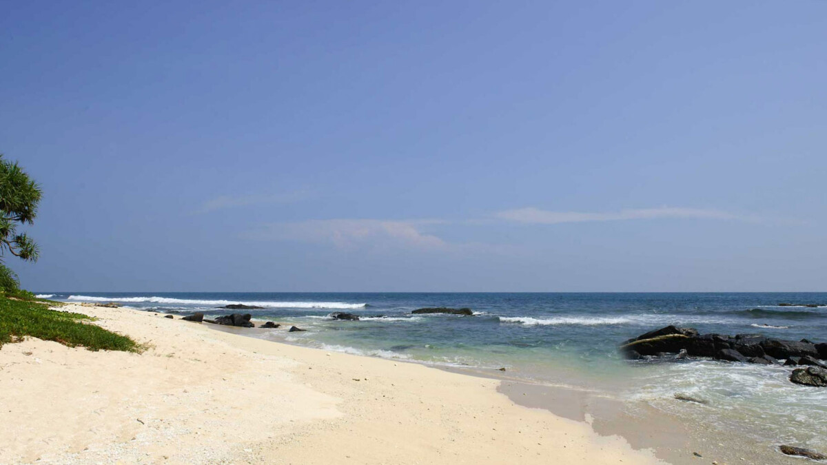 Des marches mènent à un jardin privé au bord de la plage et à une salle de yoga avec accès direct à la plage, en grande partie déserte.