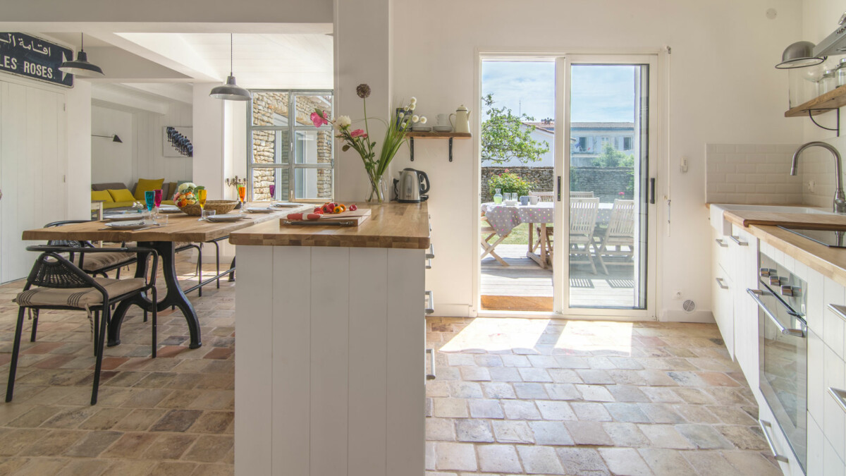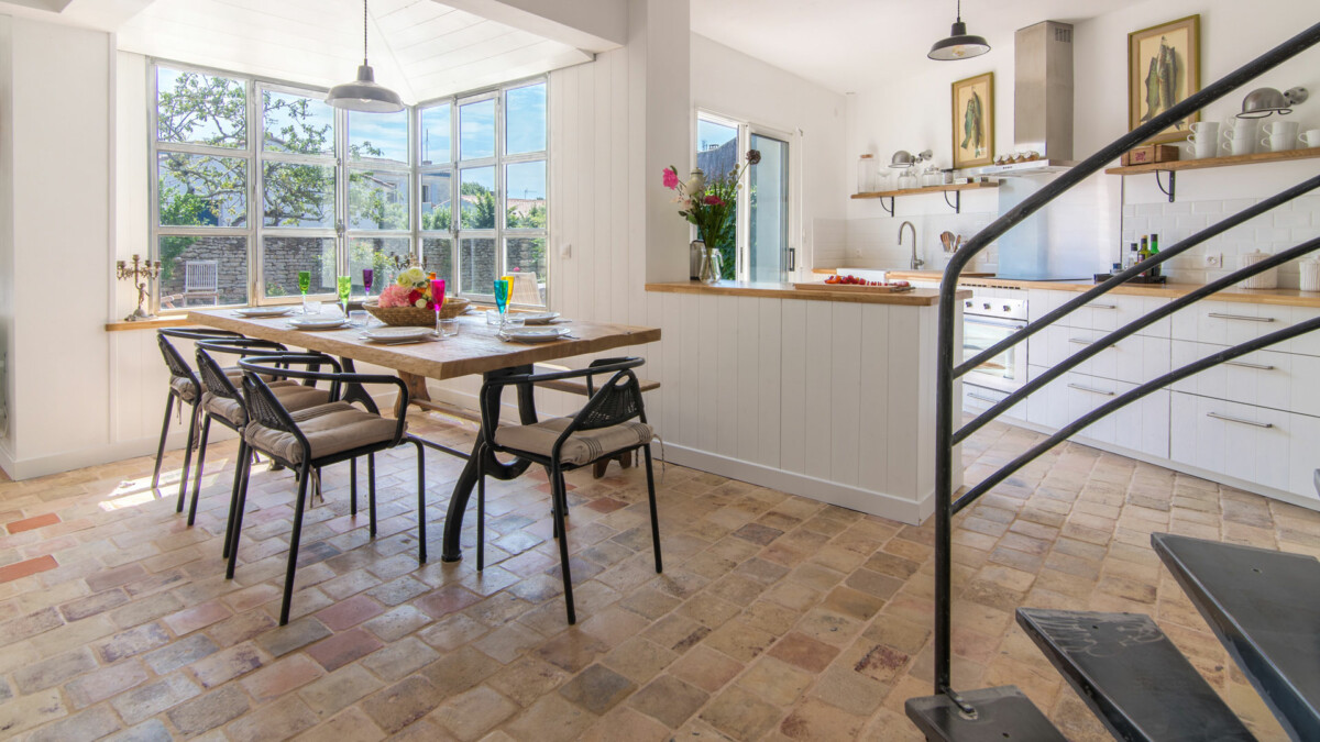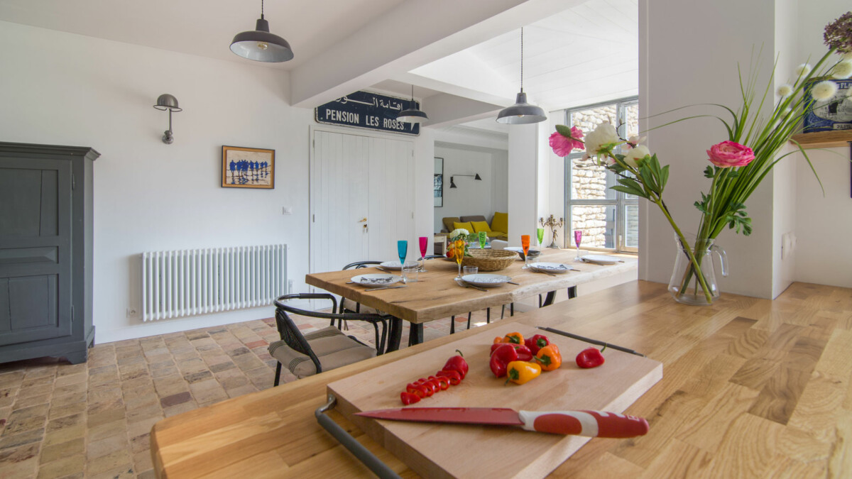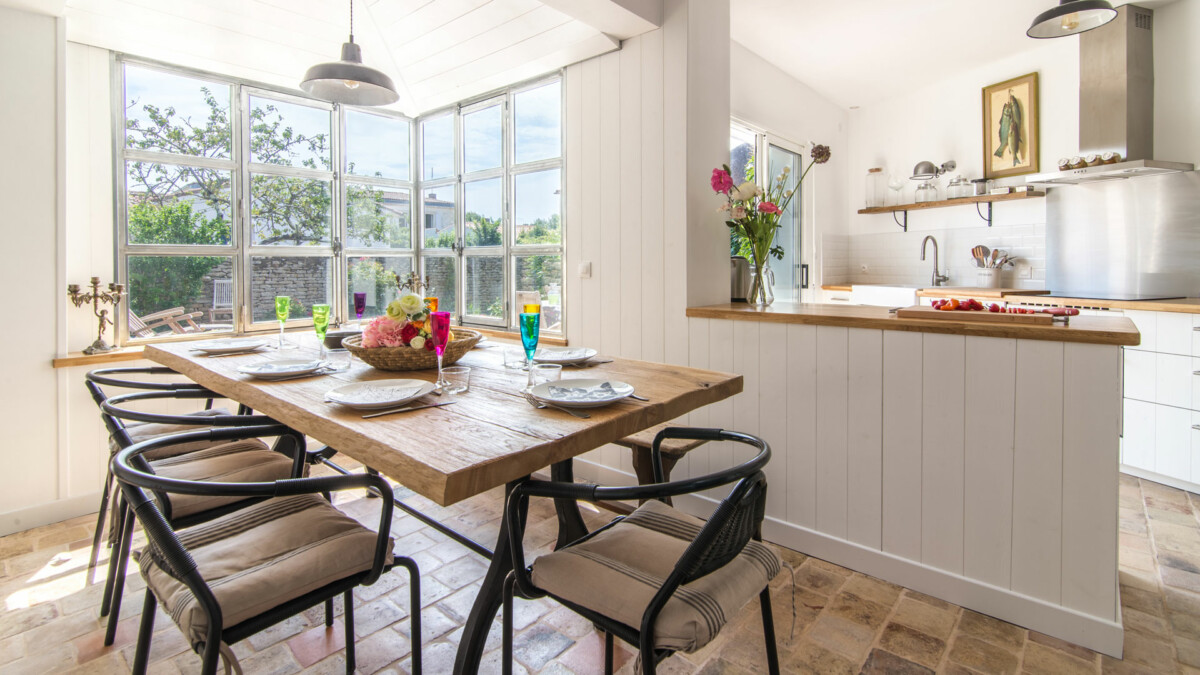 La villa Shems en Ré, d’une surface de 160m² dispose d’une cuisine entièrement équipée qui s’ouvre sur une salle à manger baignée de luminosité et d’un salon confortable avec cheminée.