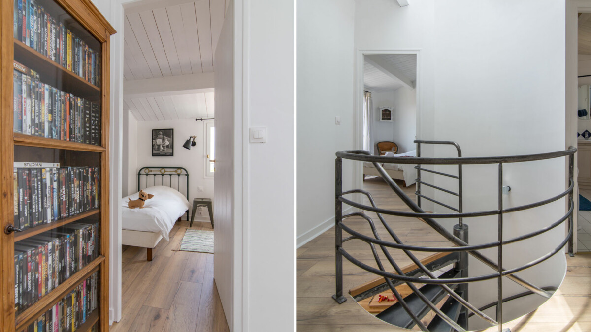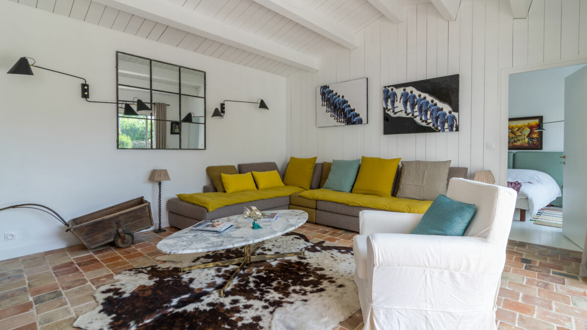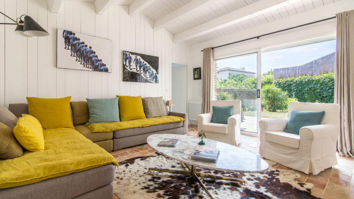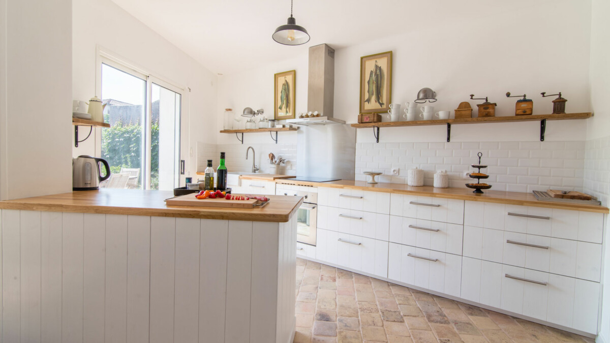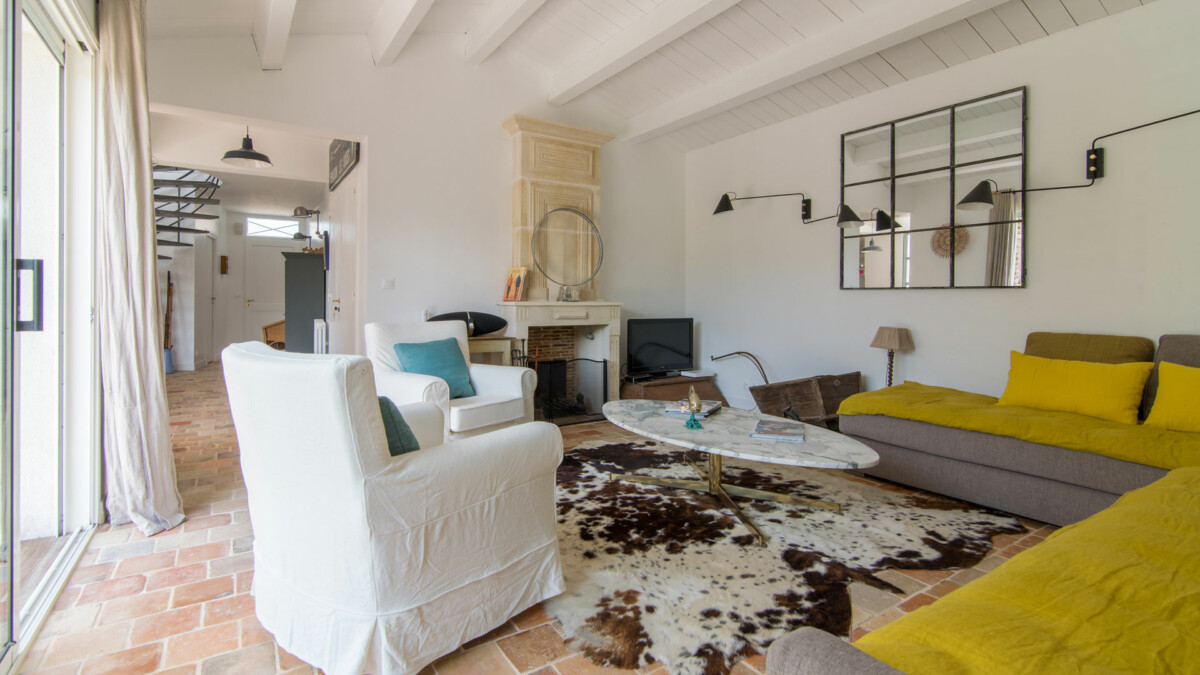 La villa Shems en Ré, d’une surface de 160m² dispose d’une cuisine entièrement équipée qui s’ouvre sur une salle à manger baignée de luminosité et d’un salon confortable avec cheminée.