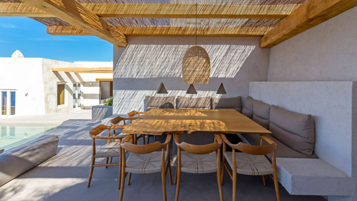 The outdoor area evolves mainly around the villa’s infinity pool positioned in the most panoramic position of the lateral terrace. Complemented by an outdoor dining area covered by a pergola and a cozy outdoor sitting area – all strictly providing extensive sea views – it allows for guests to enjoy time outdoors and indulge in relaxation with such a magnificent backdrop and surrounding.