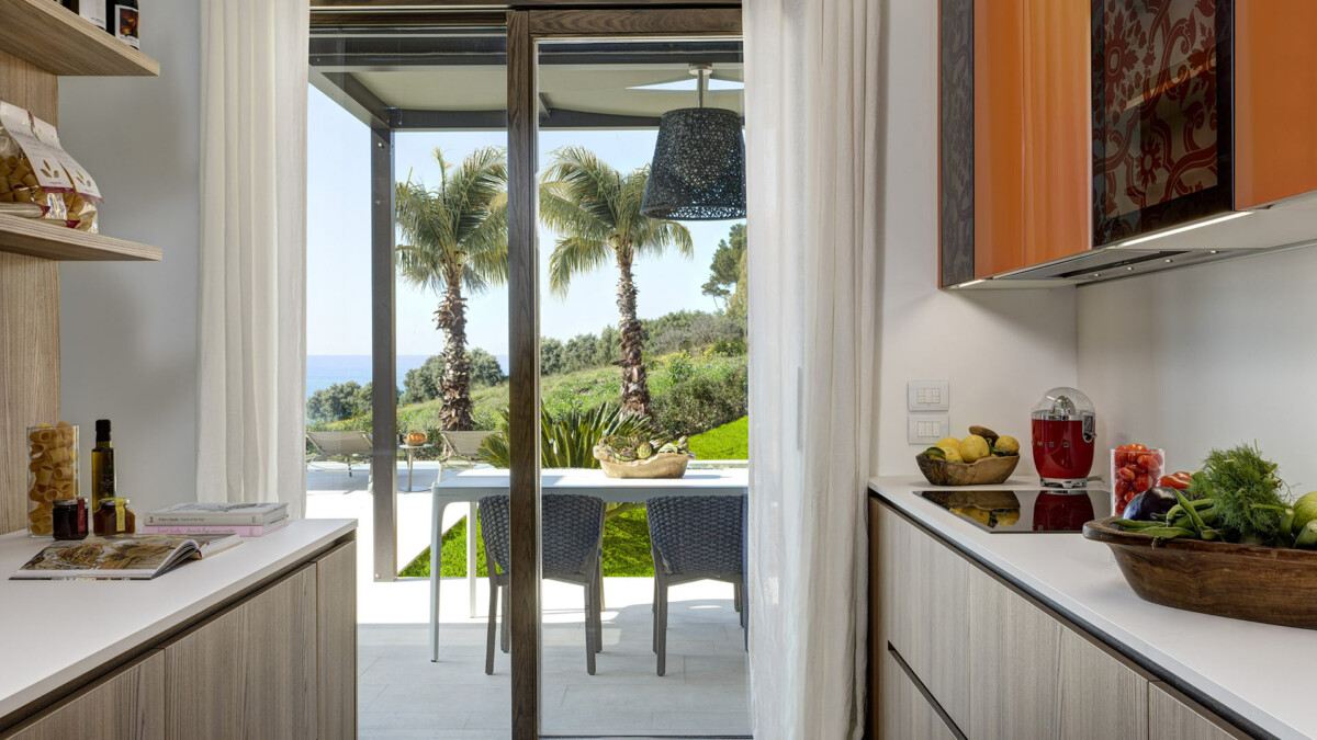 L’intérieur spacieux de la villa combine un design moderne et des matériaux naturels. Au rez-de-chaussée, les espaces de vies comprennent un salon spacieux et une salle à manger, avec une cuisine entièrement équipée. La lumière naturelle inonde l’espace, mettant en valeur les vues époustouflantes sur la mer.