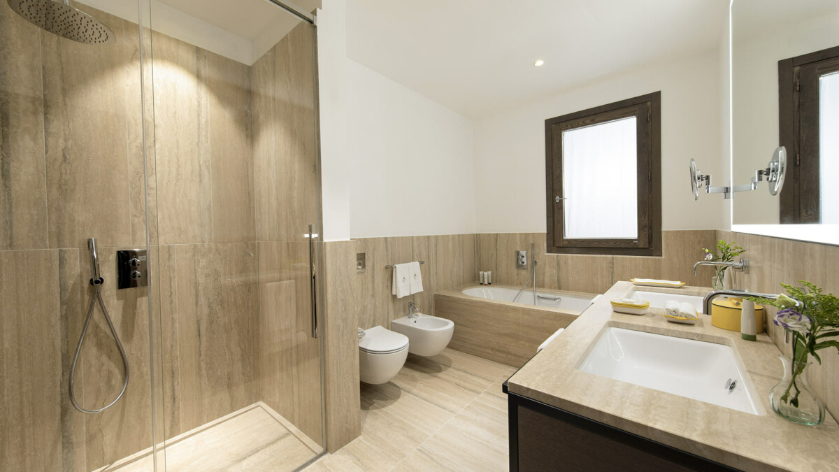 Chambre, Rez-de-chaussée. La chambre propose 1 lit double King size transformable en lits twin. Salle de bain attenante, avec 2 vasques, baignoire, douche à l’italienne. La chambre inclut également : climatisation, TV.