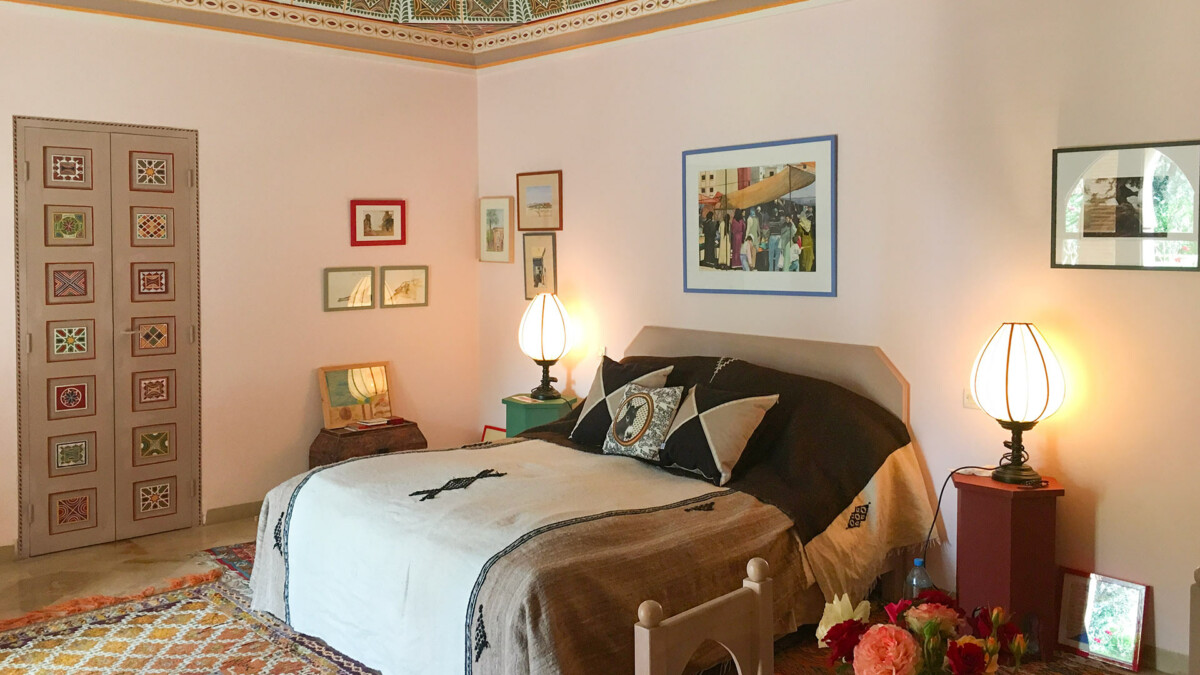 Le riad berbère, inspiré de l’architecture des ksars fortifiés est grand ouvert sur l’immense jardin. Ses 2 tours grandioses, décorées de motifs géométriques berbères, offrent une vue magnifique sur les montagnes. Son toit terrasse, qui surplombe une étendue d’oliviers et qui accueille une collection de cactus, vous offre un agréable lieu de détente et de partage. Ce premier riad comporte 3 chambres doubles (avec salles de bain et toilettes), deux pièces de vie (en enfilade) de 130m2 et une cuisine. Deux pièces d’eau, inspirées de palais andalous prolongent les deux pièces de vie : côté salon, vous retrouverez la longue piscine et côté salle à manger, un bassin à jets d’eau. Les chambres donnent quant à elles sur une galerie à colonne (avec des plafonds tressés de laurier : « Tataoui ») et sur une fontaine en marbre noir. L’une des chambres s’ouvre sur un parterre de roses et de buis taillés à la française. Le grand salon, avec son superbe plafond peint de motifs cosmogoniques et son confortable canapé, offre un lieu de partage et de repos des plus agréable. Vous serez également charmés par la salle à manger, dotée de portes anciennes et d’un plafond en bois peints.