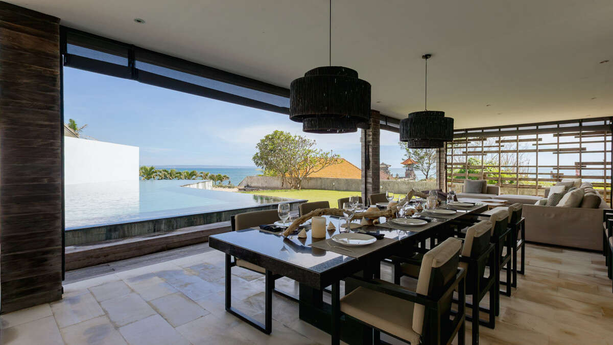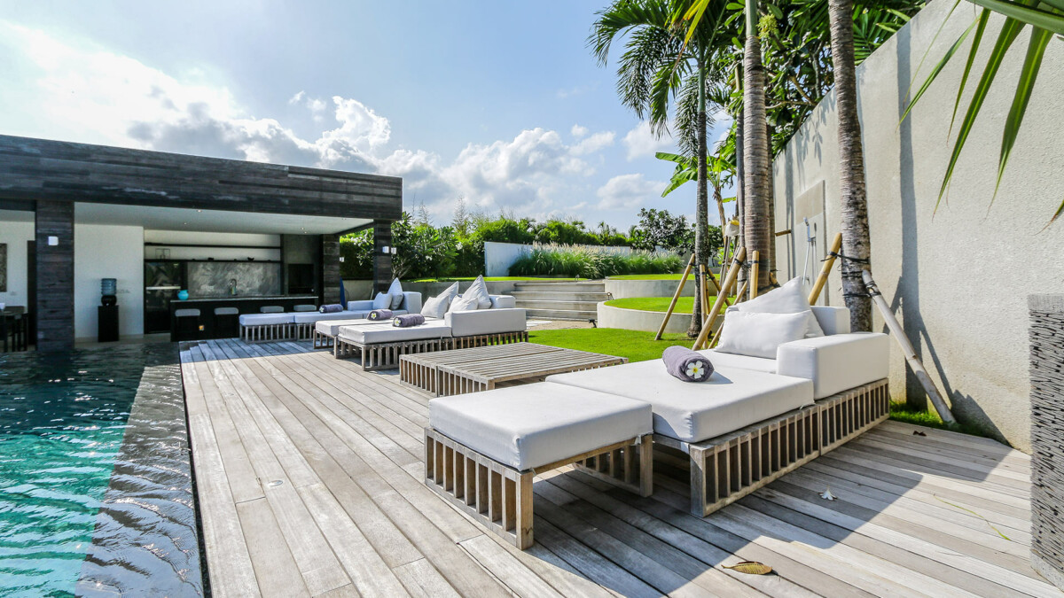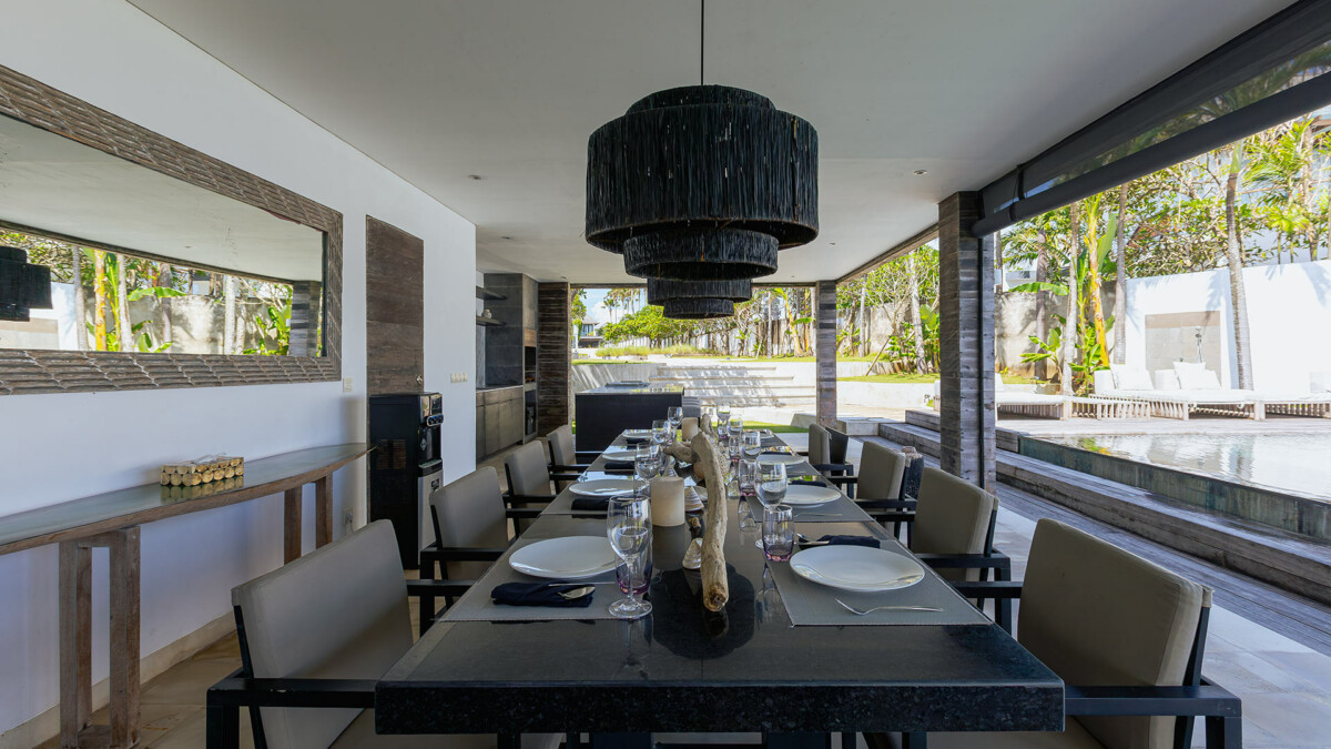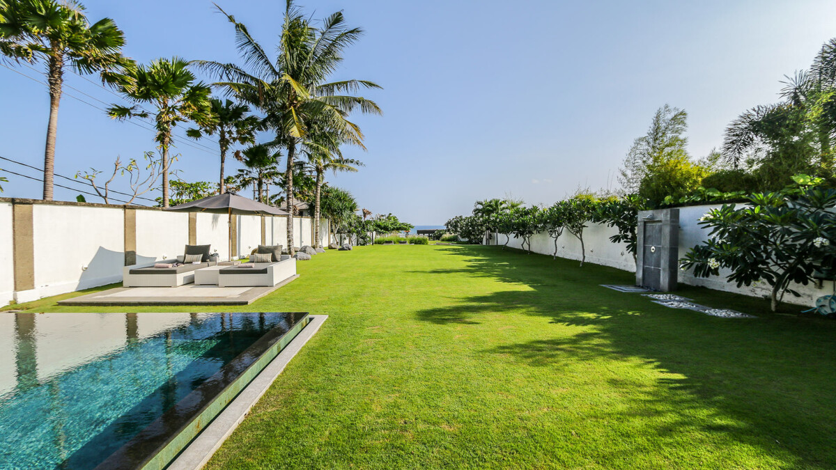 Les extérieurs invitent à la détente avec deux grandes piscines à débordement (18 m x 4 m, profondeur 1,5 m pour la piscine latérale, et 18 m x 6 m profondeur 1,4 m pour la piscine côté plage), un pavillon de plage avec un espace repas et un coin salon, un bar extérieur et un barbecue. La terrasse sur le toit offre une vue imprenable sur la mer, et un accès à la mer privé direct vous invite à de nombreuses baignades.