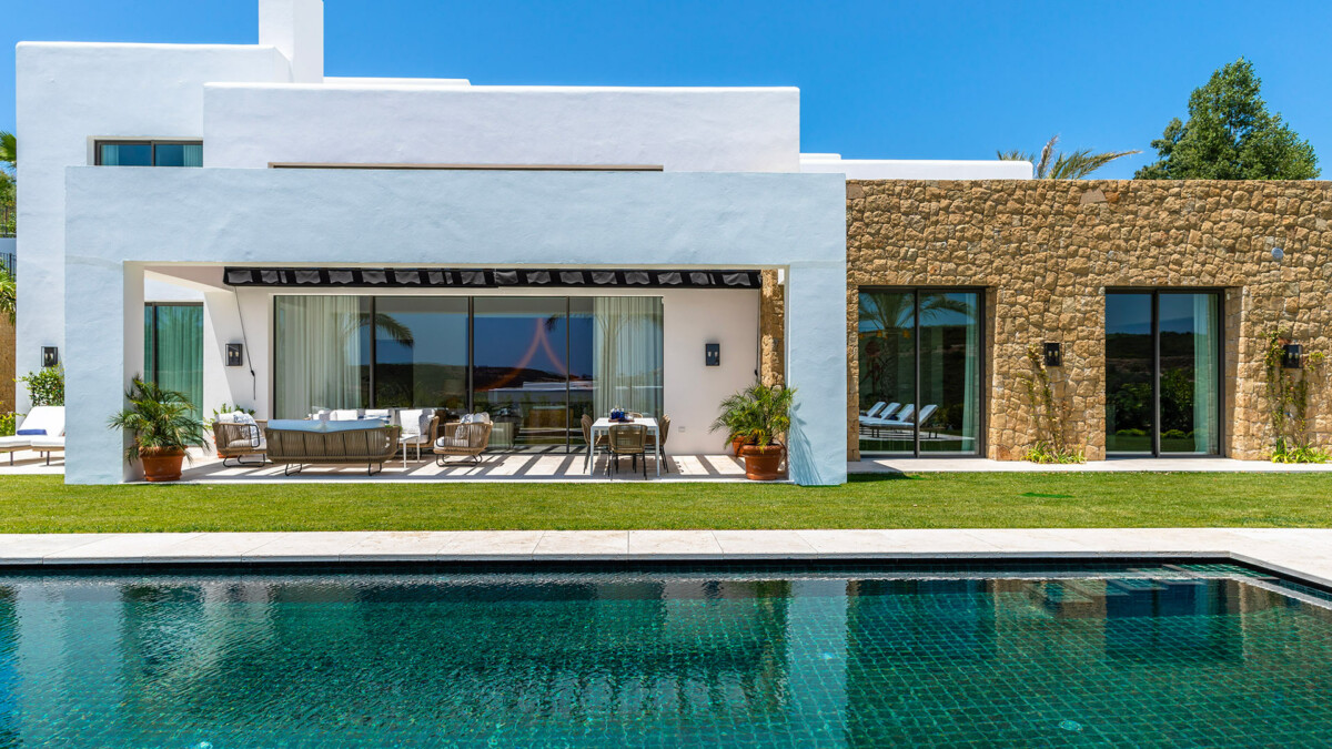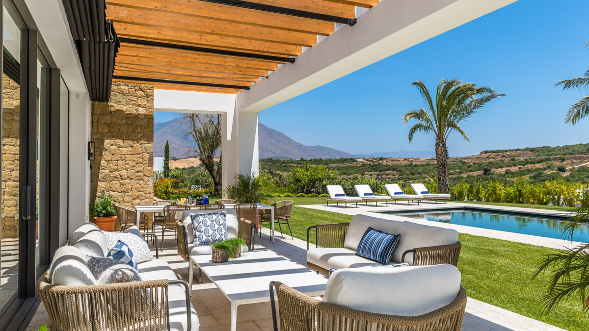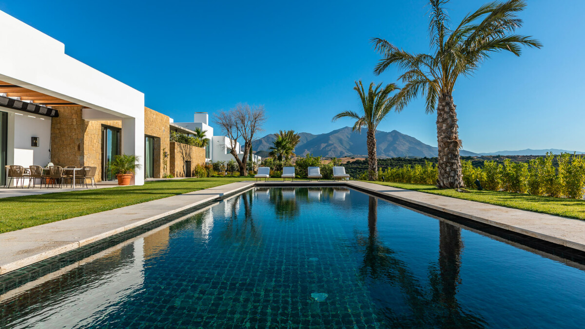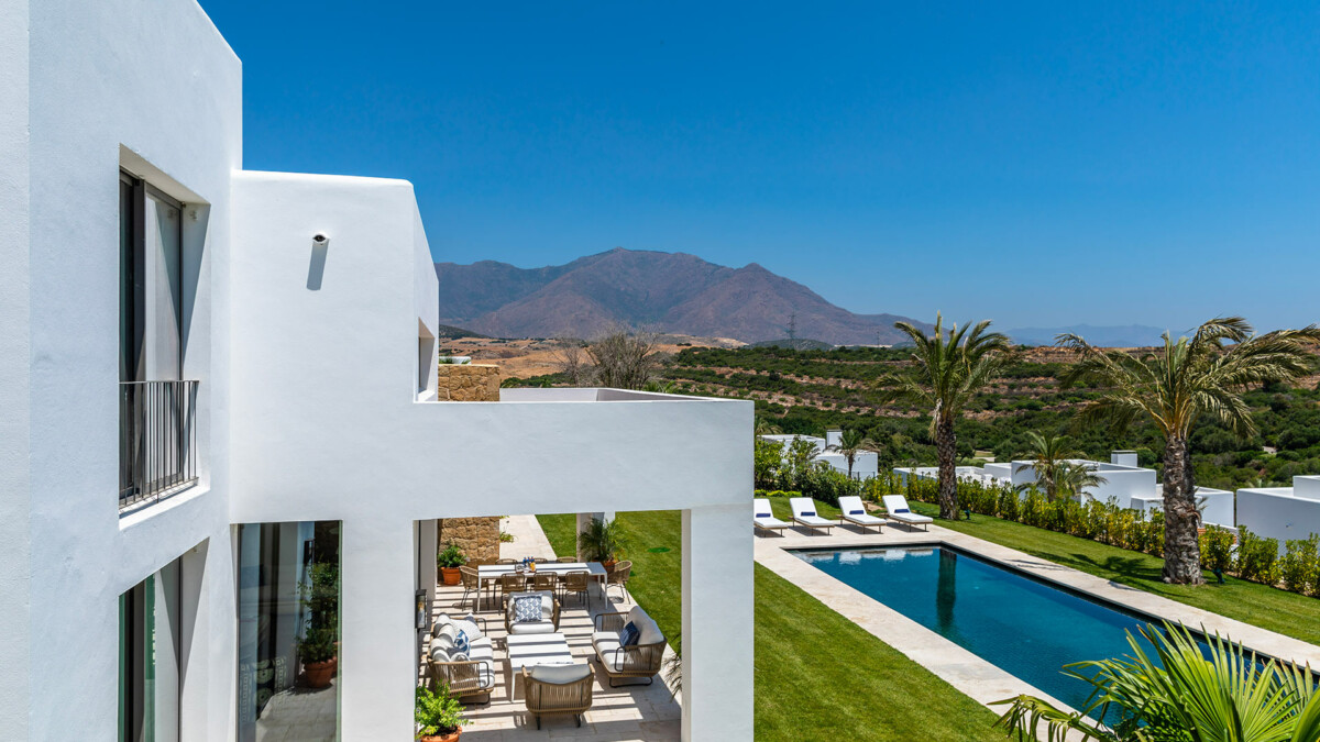 The exteriors of the villa reflect a private paradise. The grounds, built on gentle slopes, guarantee magnificent views of the golf course and the Sierra Bermeja mountains. The private garden stretches elegantly towards the shimmering pool, inviting moments of relaxation in the sun. With ample outdoor space, including parking (2 cars) the tranquillity and beauty of the surrounding nature can be enjoyed in absolute privacy and comfort.