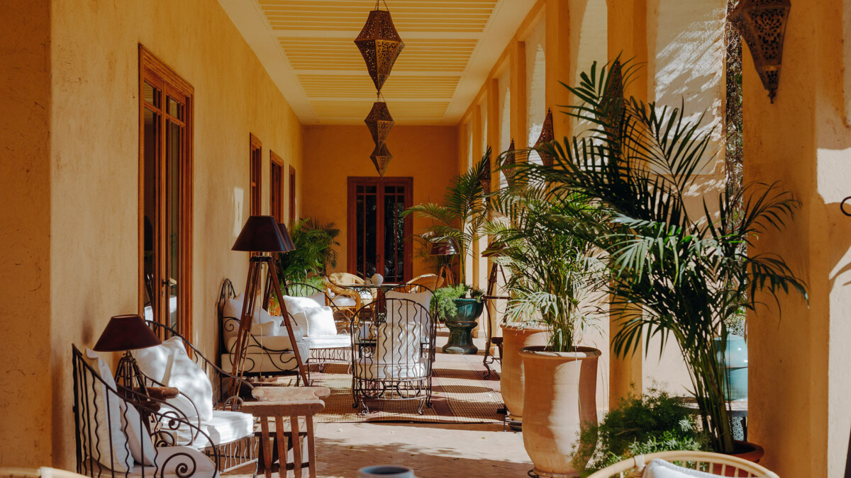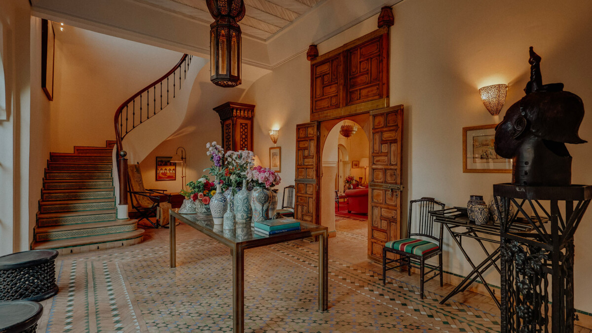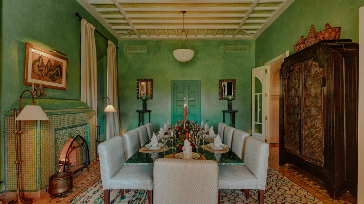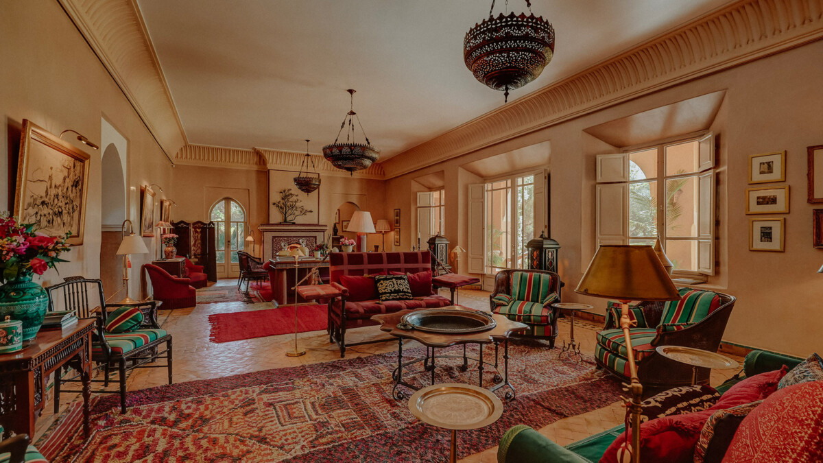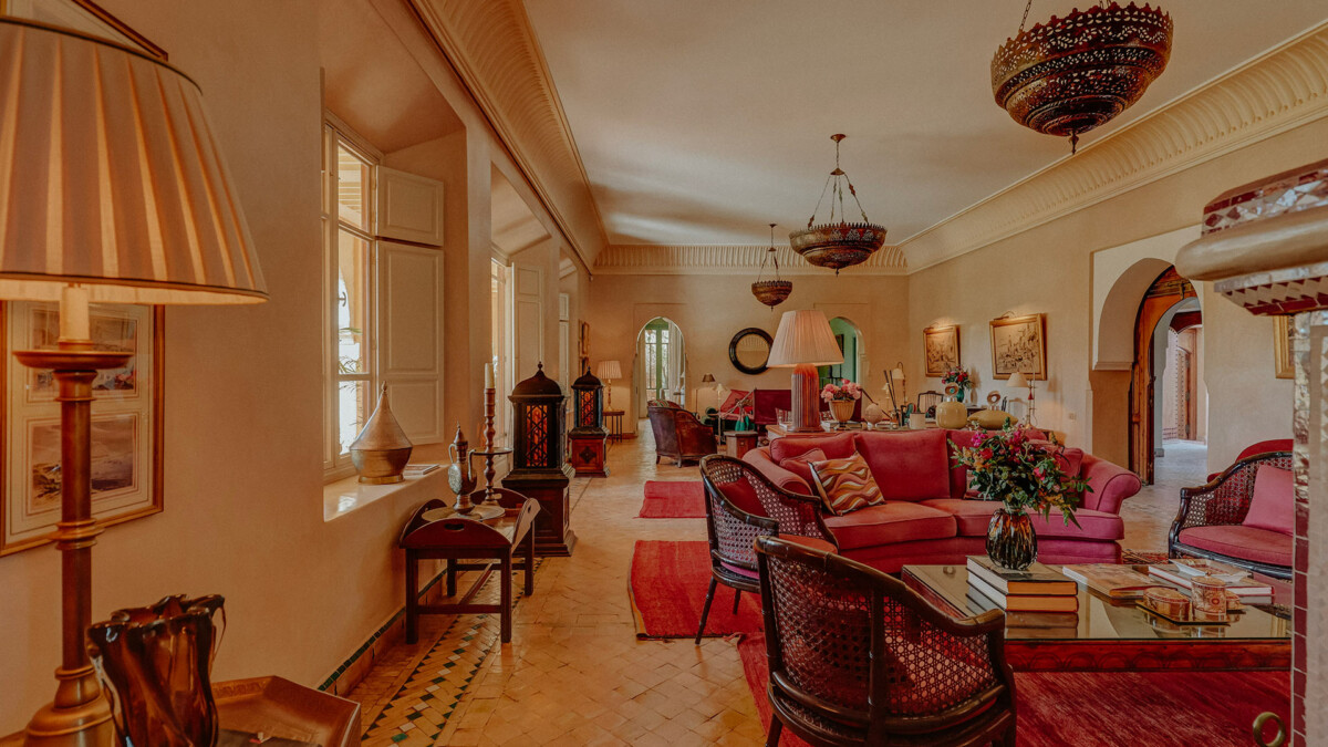 L’intérieur est une ode au design raffiné, orchestré par le légendaire Bill Willis. Les espaces de vie communs, tels que le salon et la salle à manger, marient à merveille l’esthétique marocaine traditionnelle et le confort moderne. Une majestueuse verrière à l’entrée inclut un patio orné d’oliviers et une fontaine apaisante. Ces superbes espaces mettent en scène une atmosphère intime, idéale pour les rassemblements en famille ou entre amis.
