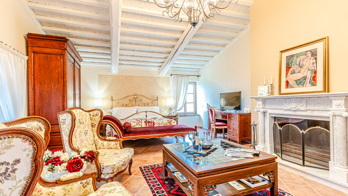 Chambre, 1er étage. La chambre propose 1 lit double. Salle de bain privée. La chambre inclut également : cheminée, terrasse privée.