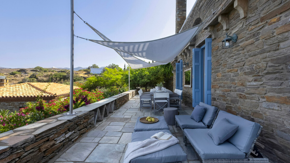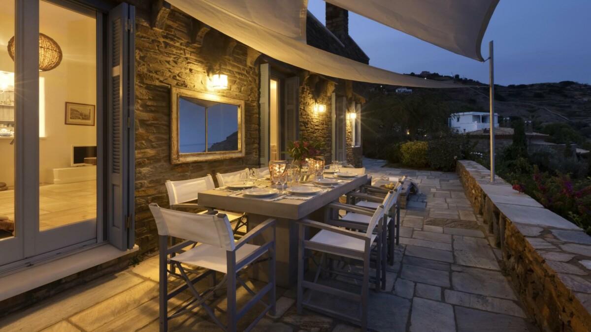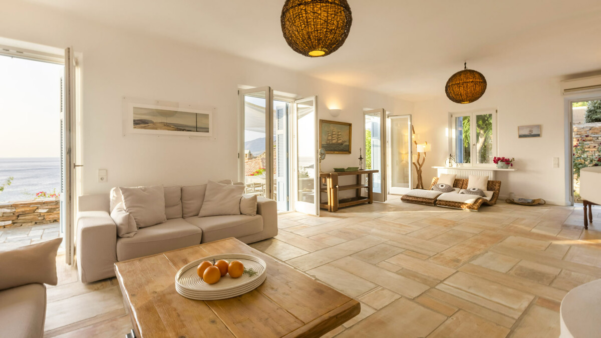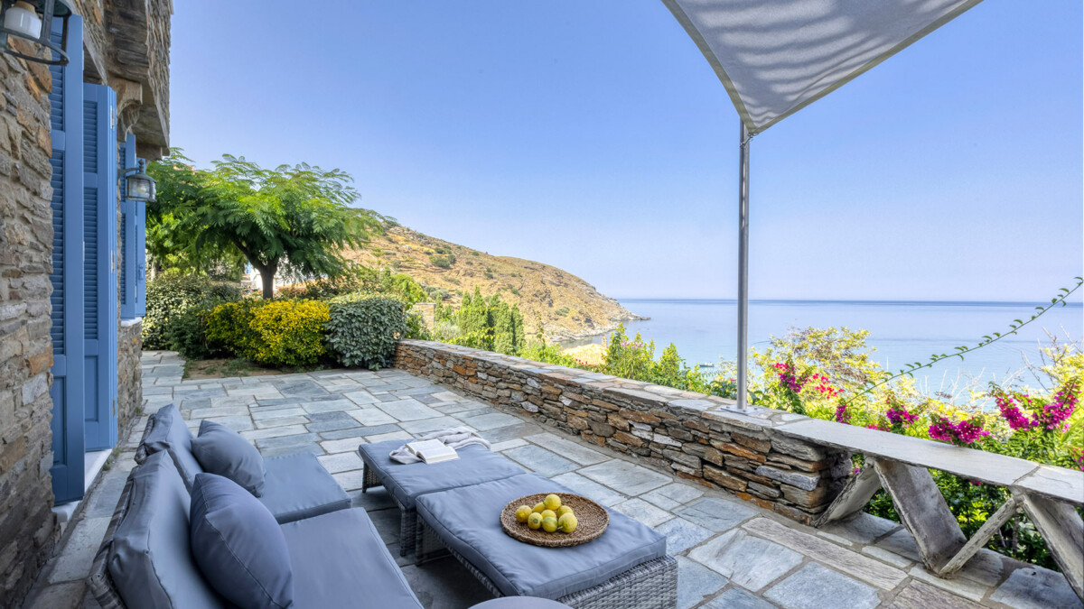 La villa se trouve sur la côte Est d’Andros, île grecque de l’archipel des Cyclades en mer Égée.