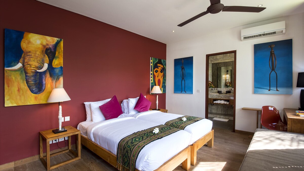 Chambre, 1er étage. La chambre propose 2 lits jumeaux transformables en lit double. Salle de bain attenante, avec 2 vasques, douche. La chambre inclut également : climatisation, coin bureau, TV.
