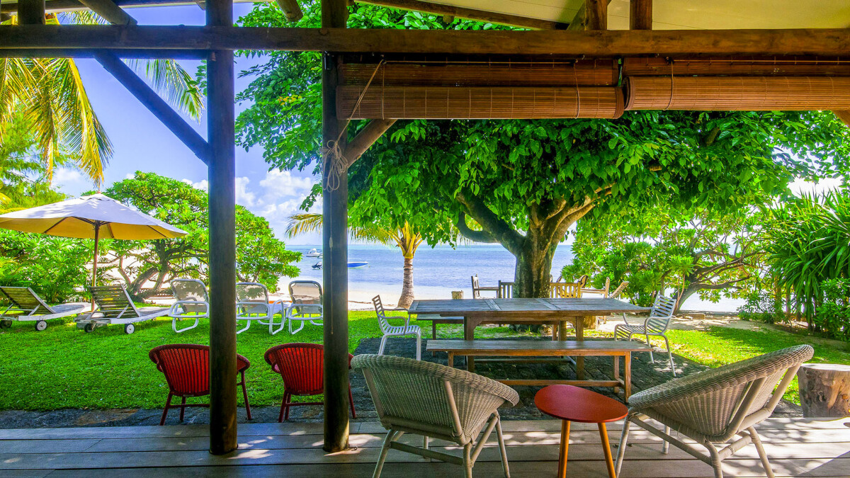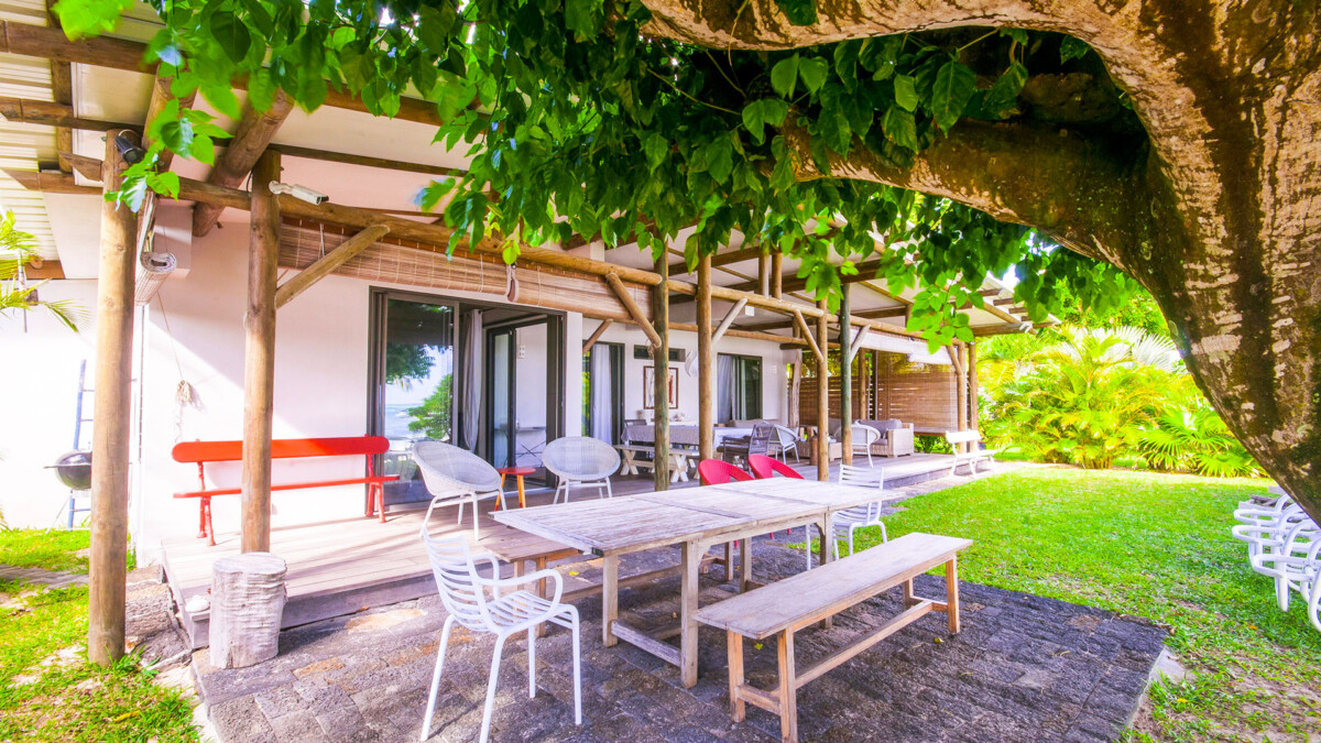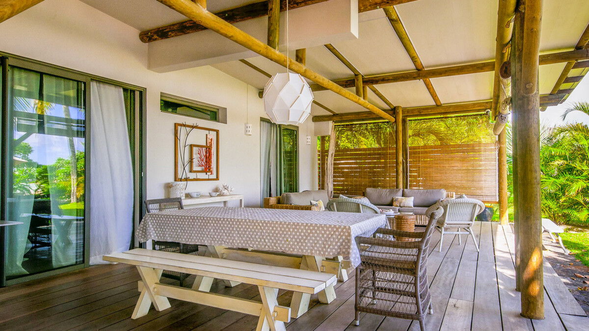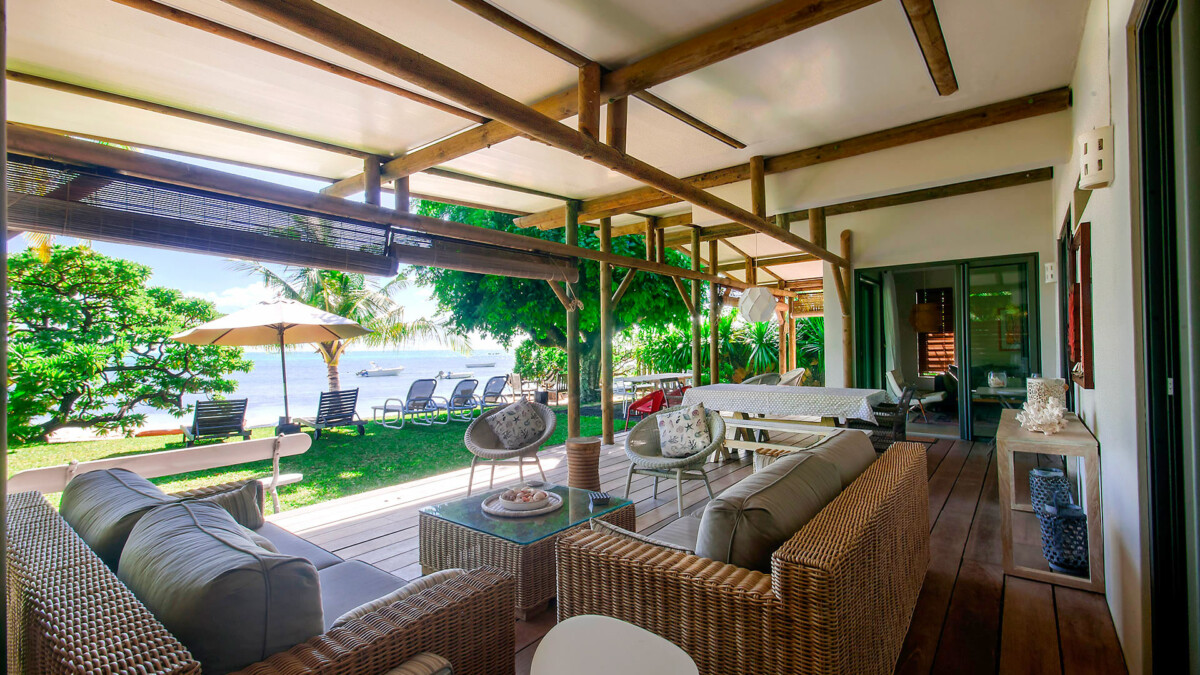 Un deck en bois exotique sous une varangue face à la plage et la mer avec salon et salle à manger extérieure, vous offre une magnifique vue.