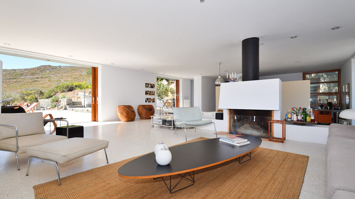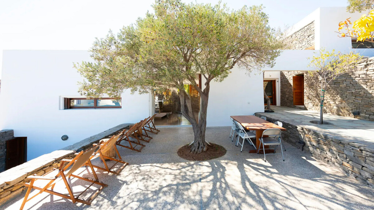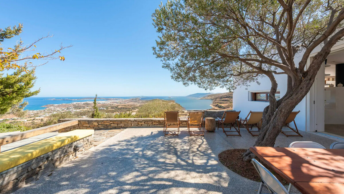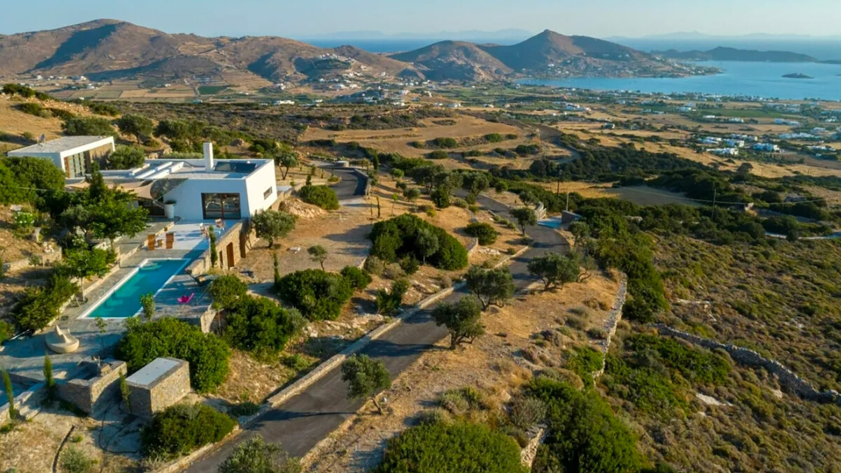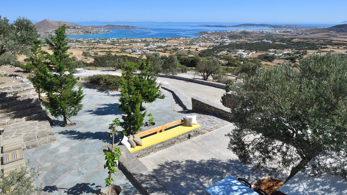 La propriété se trouve sur un domaine de 14 000 mètres carrés, joliment arboré d’oliviers, de cyprès, de figuiers et comporte également des centaines de plantes aromatiques sauvages comme la sauge, le thym et le romarin. La propriété offre de superbes vues panoramiques sur les îles voisines : Myconos, Naxos, Tinos.