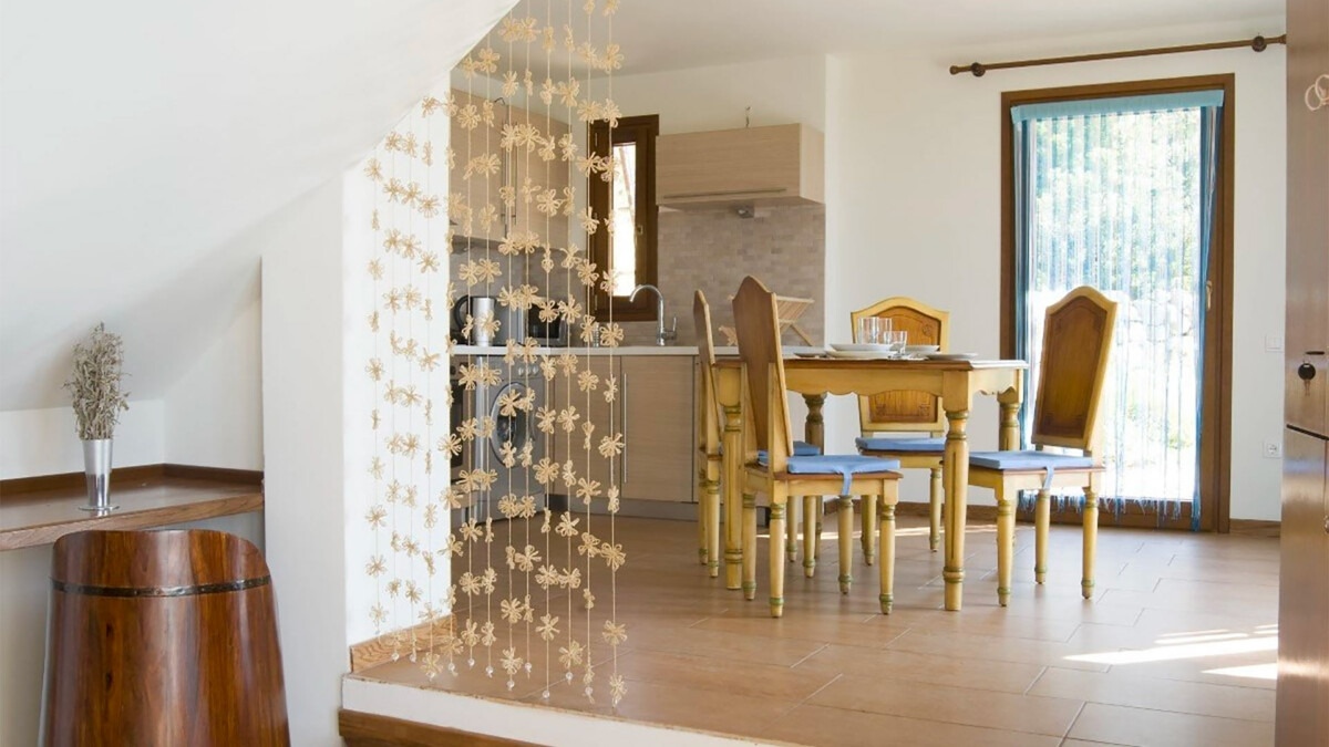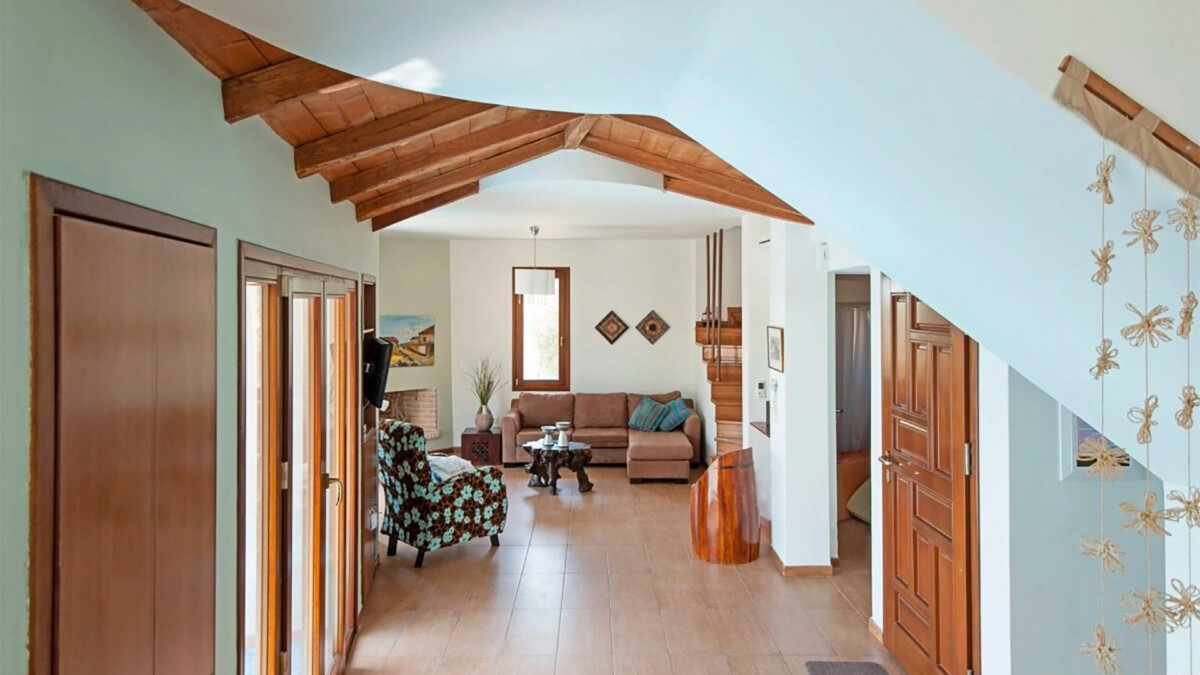 Au rez-de-chaussée, dès que vous entrez, la piscine captive votre regard. Au même étage, une cuisine entièrement équipée avec tous les appareils modernes, un salon spacieux en bleu et brun, une salle à manger et une salle de bain pour invités. Deux escaliers intérieurs en bois construits séparés mènent à l’étage aux deux chambres situées à l’étage supérieur de la villa.