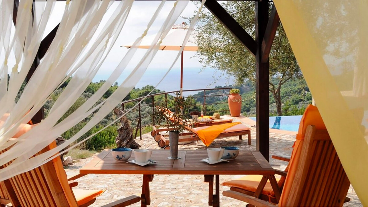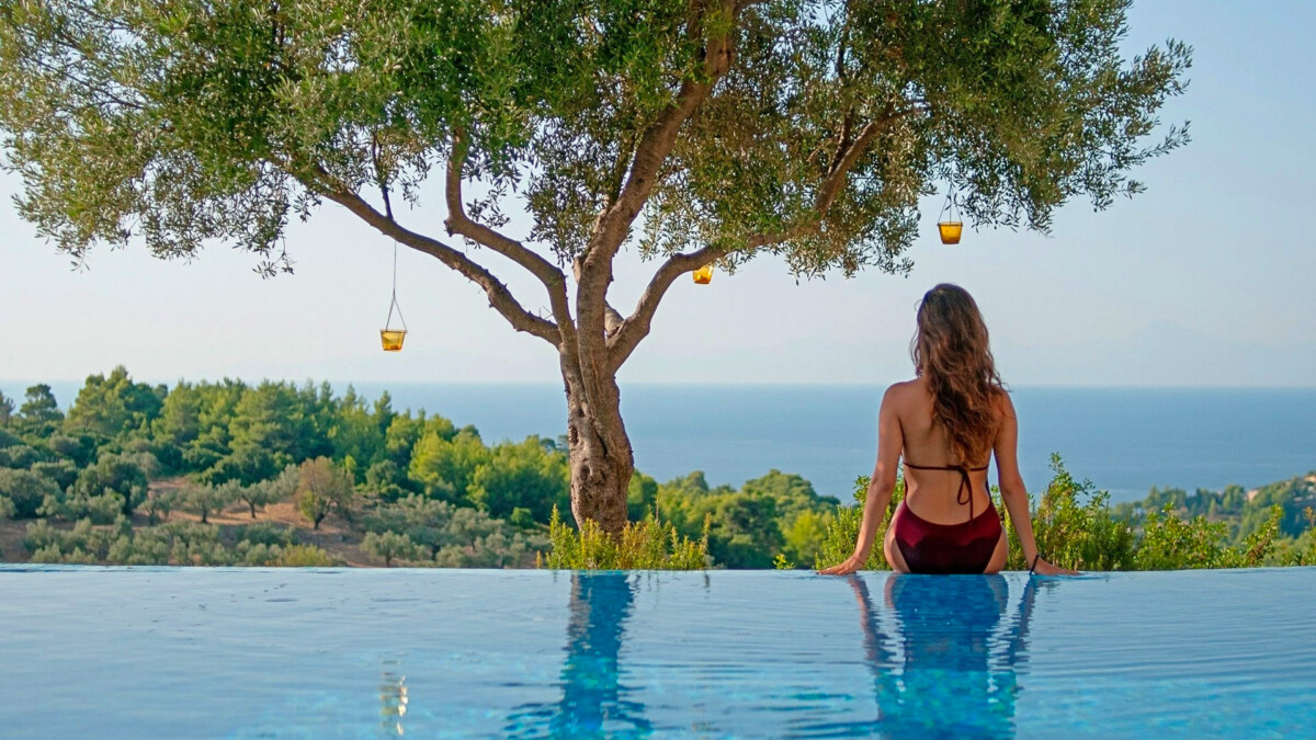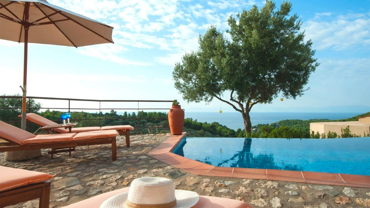À l’extérieur, se nichent une espace pour les repas avec une pergola en bois et des oliviers pour l’ombre et la piscine privée à débordement avec des chaises longues en bois et une vue sur l’oliveraie et la mer Égée.