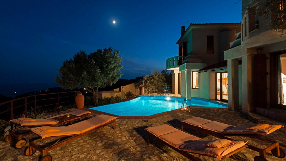 La villa se trouve à seulement dix minutes en voiture du port de Patitiri, à travers la forêt.