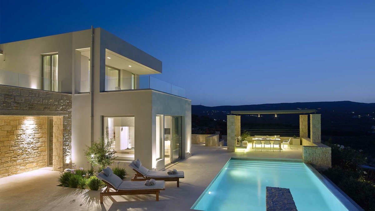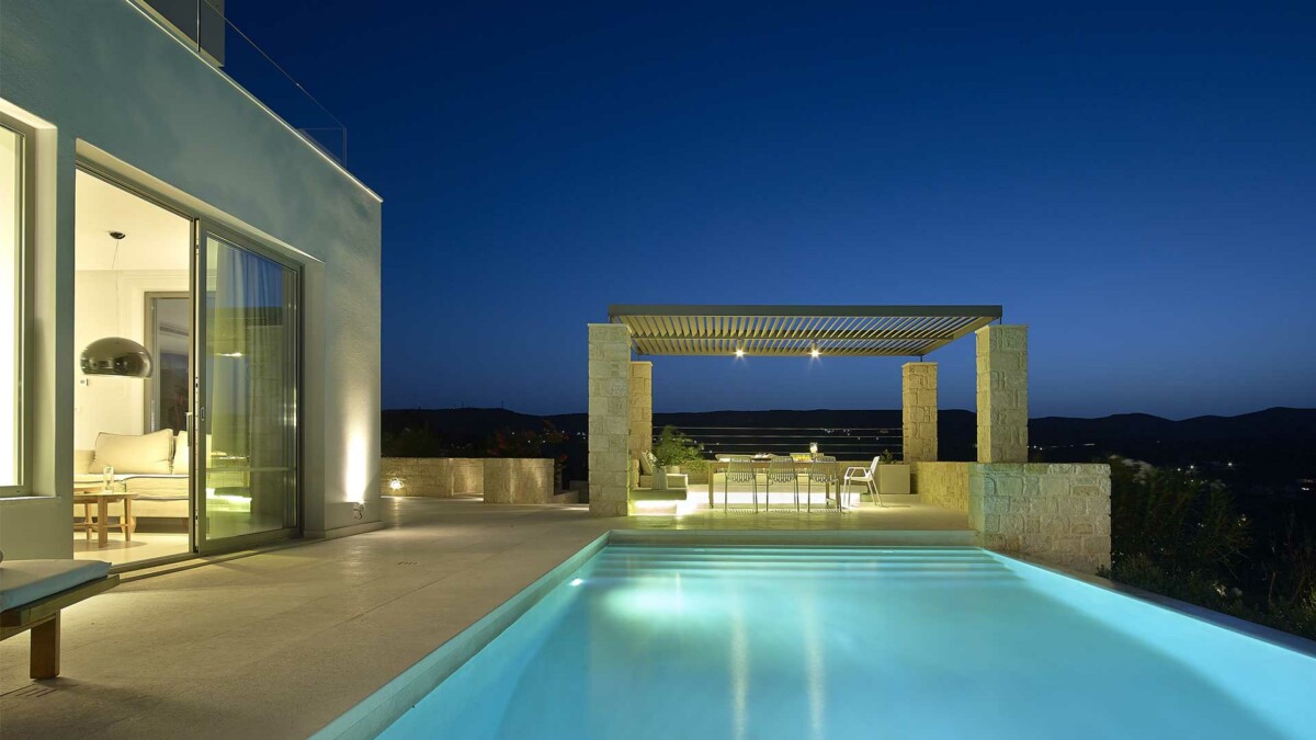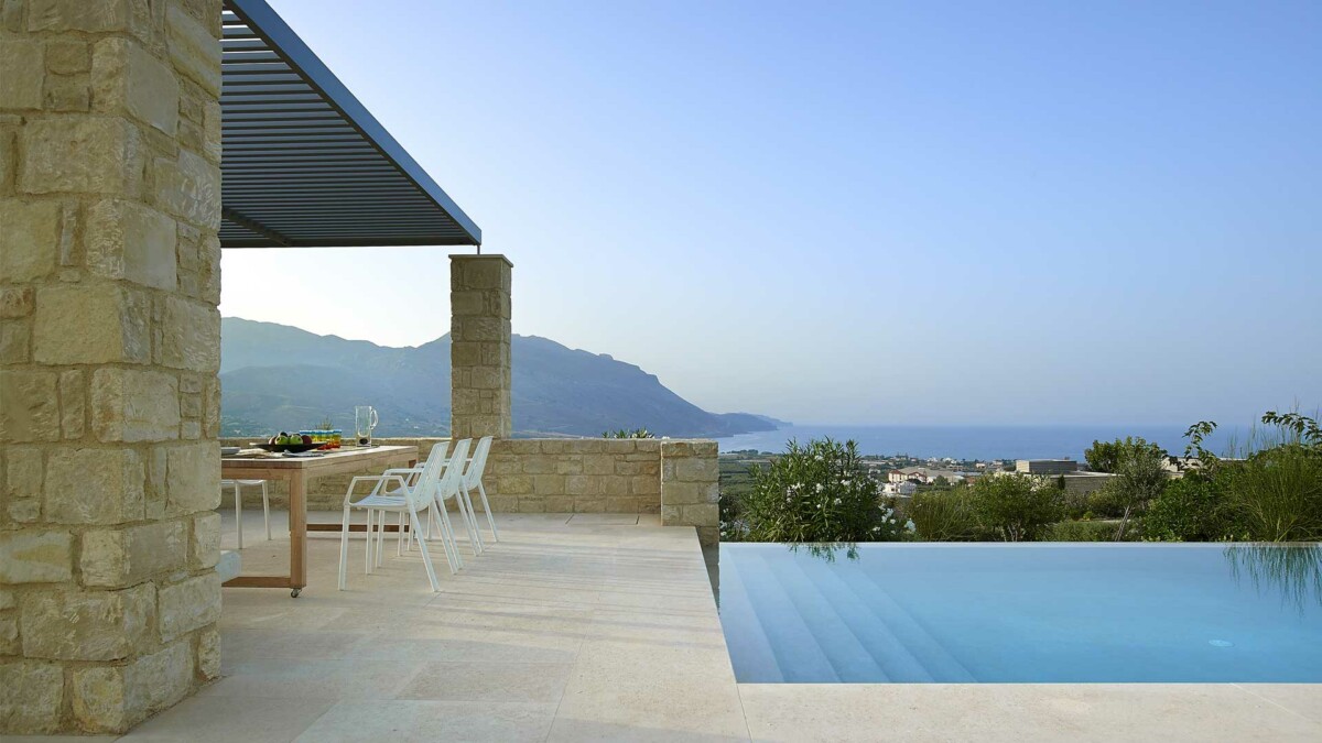 Avec une terrasse en pierre naturelle qui fait face à la propriété, la villa bénéficie d’une piscine à débordement privée recouverte d’une surface caractéristique de Cimentogonia et de marches romaines pleine largeur.