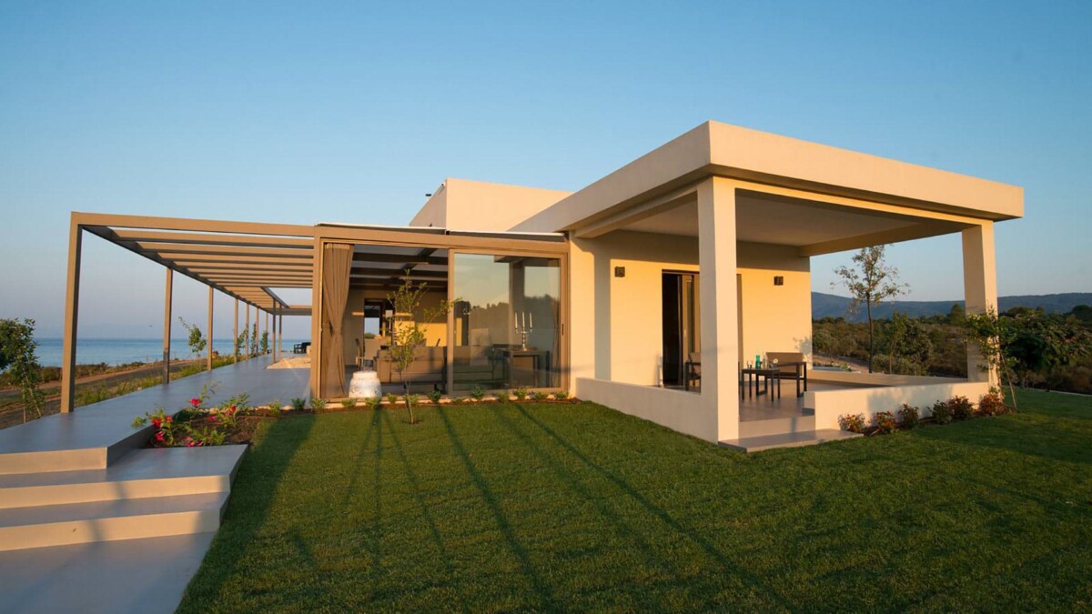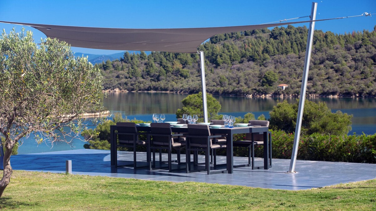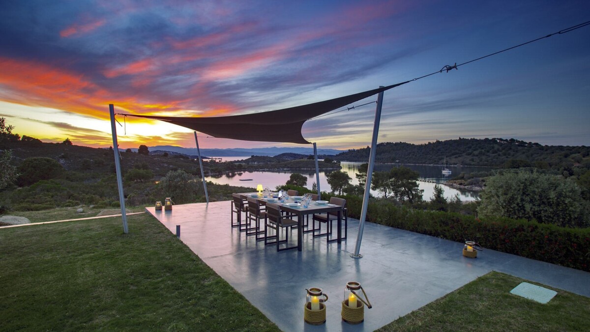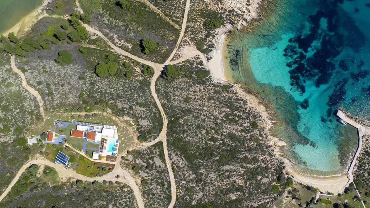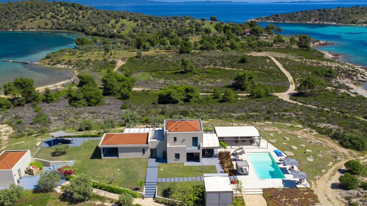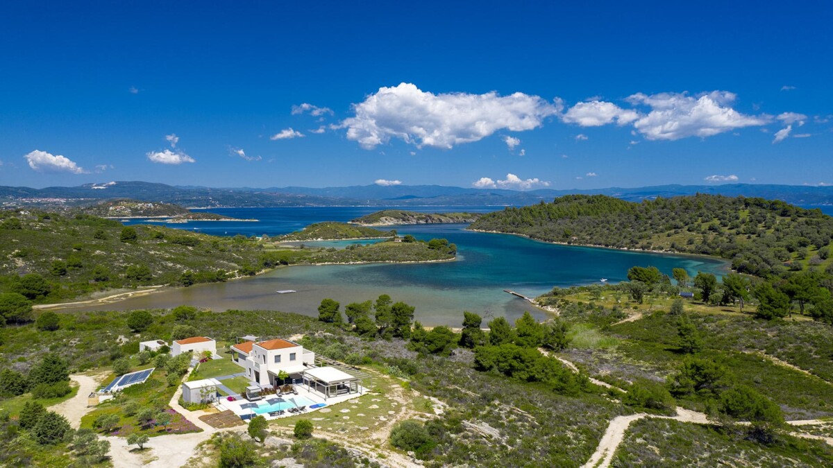 Le spacieux rez-de-chaussée de 130 m2 comprend des baies vitrées, une cuisine et un coin repas d’hiver. Le panorama à couper le souffle offre une vue sur les deux criques, la mer à perte de vue – aussi loin que le mythique mont Athos se profile à l’horizon – tous ces atouts naturels se combinent pour faire de vos vacances un rêve ultime.