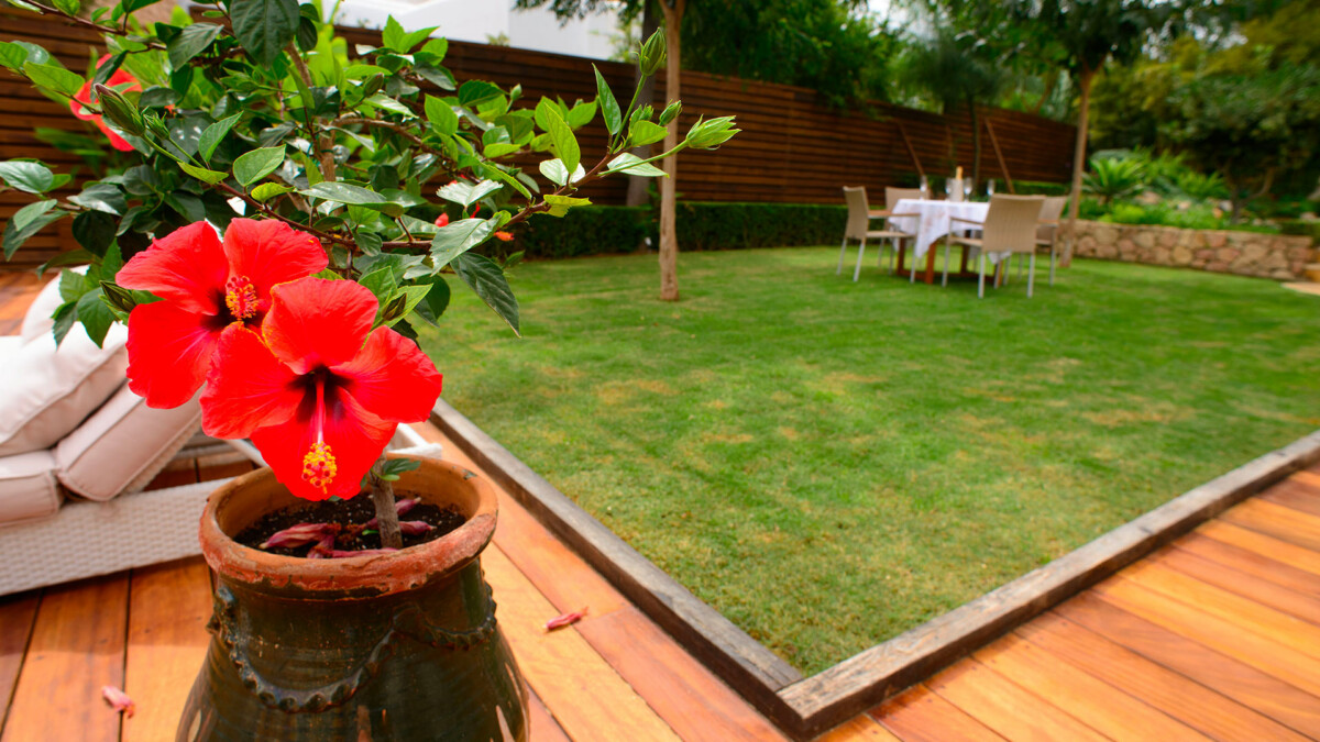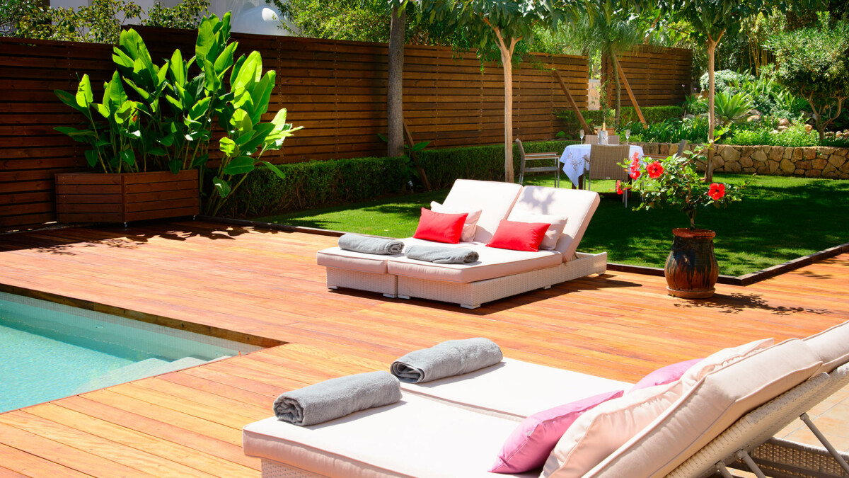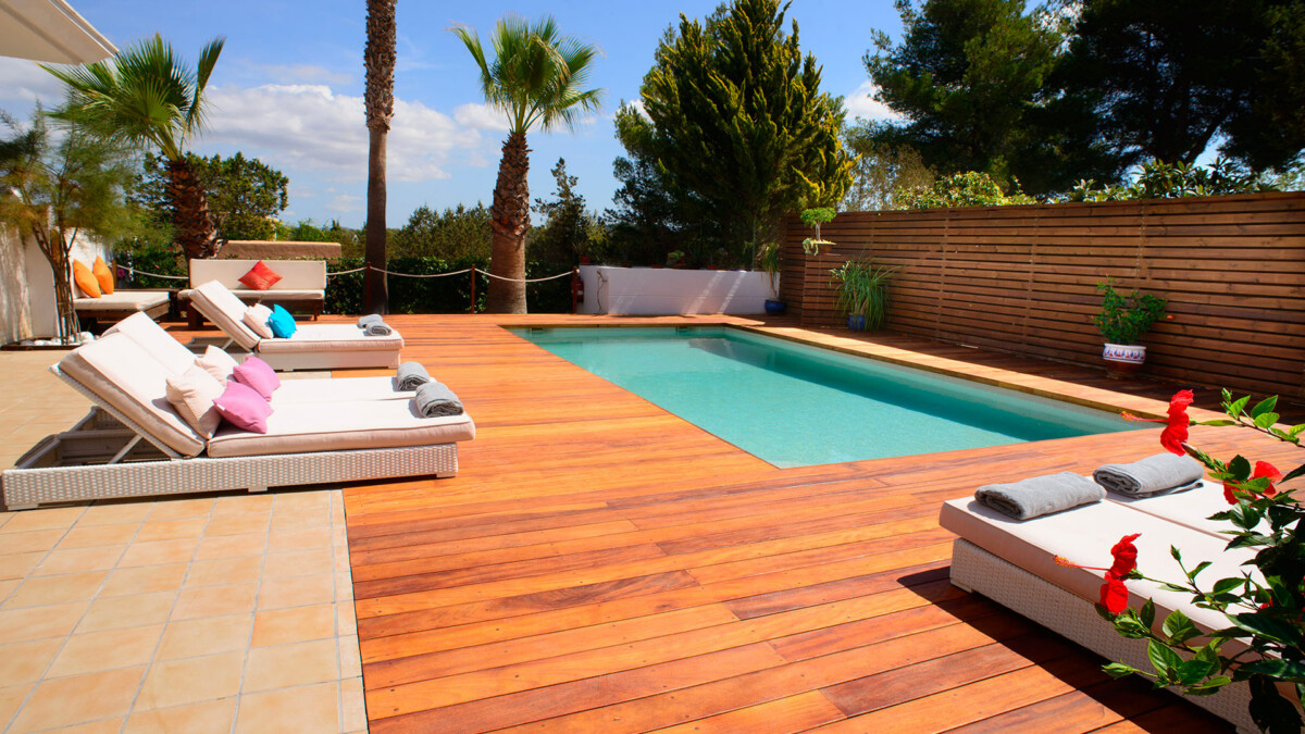 Piscine de 8 x 4 m avec une profondeur maximale de1.50 cm entourée de terrasses en bois.