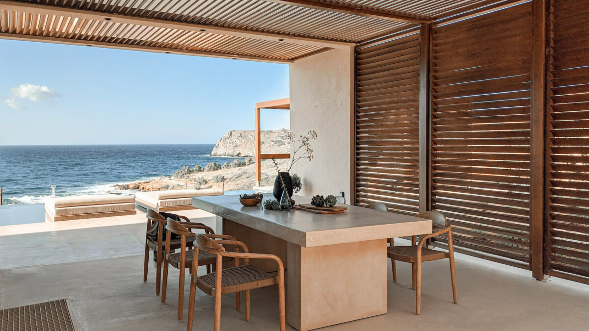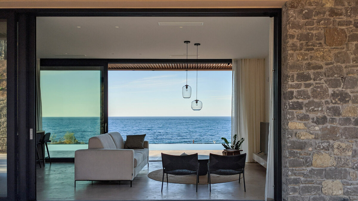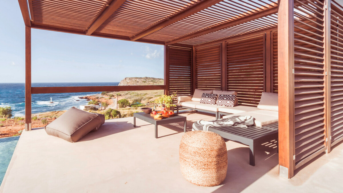 Dans un cadre méditerranéen serein avec des vues spectaculaires sous tous les angles, les pergolas en bois dans les espaces extérieurs, protègent de l’air et fournissent de l’ombre, permettant aux invités de profiter d’un dîner en plein air dans le salon et les salles à manger. La fonctionnalité et la simplicité de la villa conviennent parfaitement à l’environnement naturel, tandis que la terrasse spacieuse avec sa piscine à débordement dans les tons de gris et de bleu dégage un sentiment de calme et de lumière.