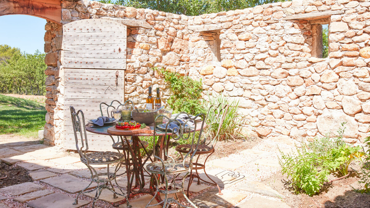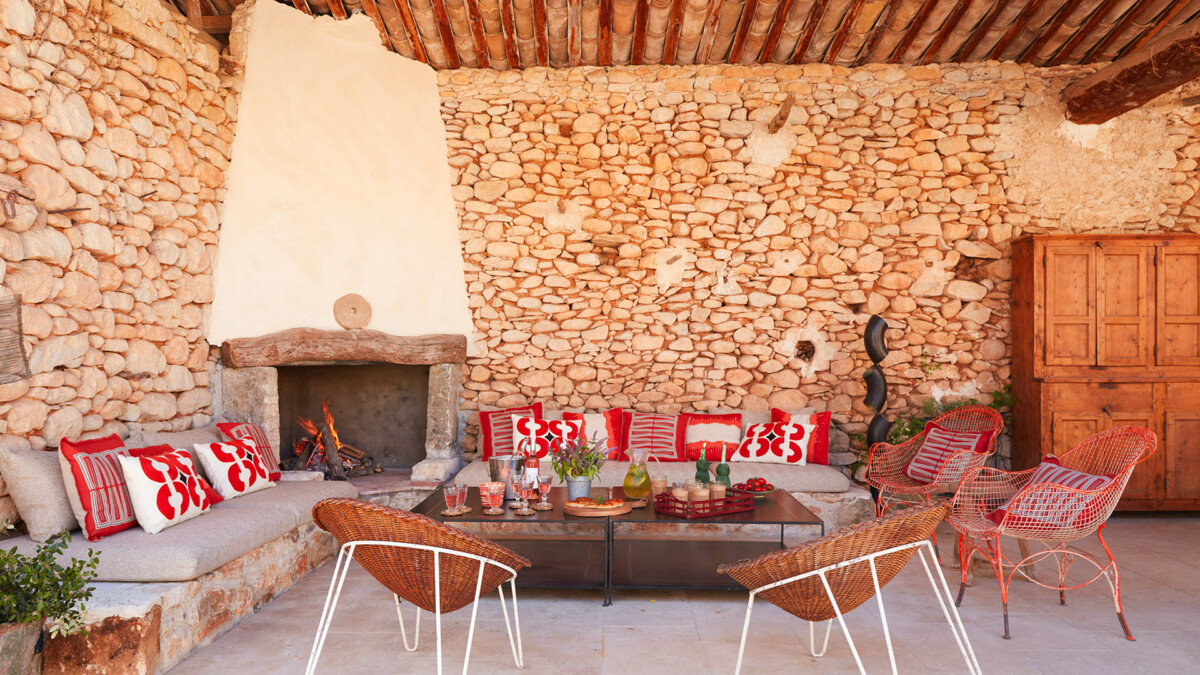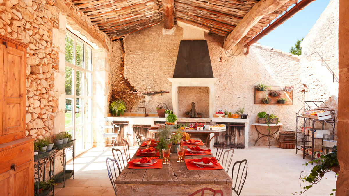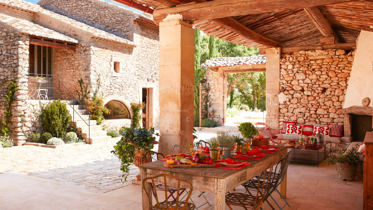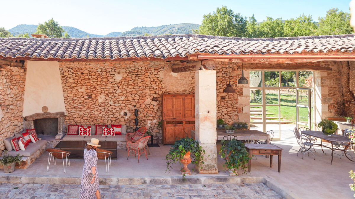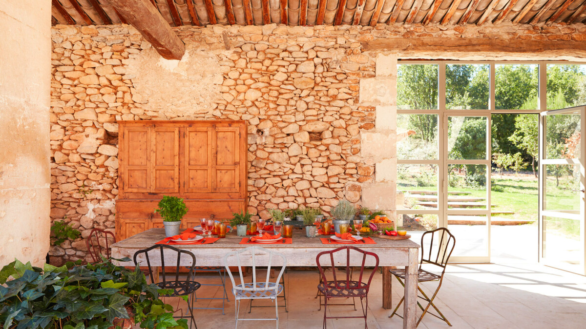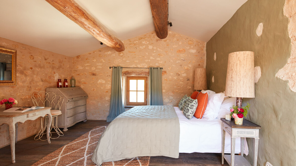Le mas dispose du charme rustique de la Provence, avec ses murs en pierre enduits à la chaux, ses tomettes traditionnelles, ses meubles en bois bruts, ses tissus de lin et ses tons ocre, vert olive ou encore terre de sienne.