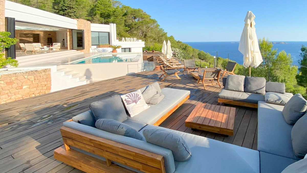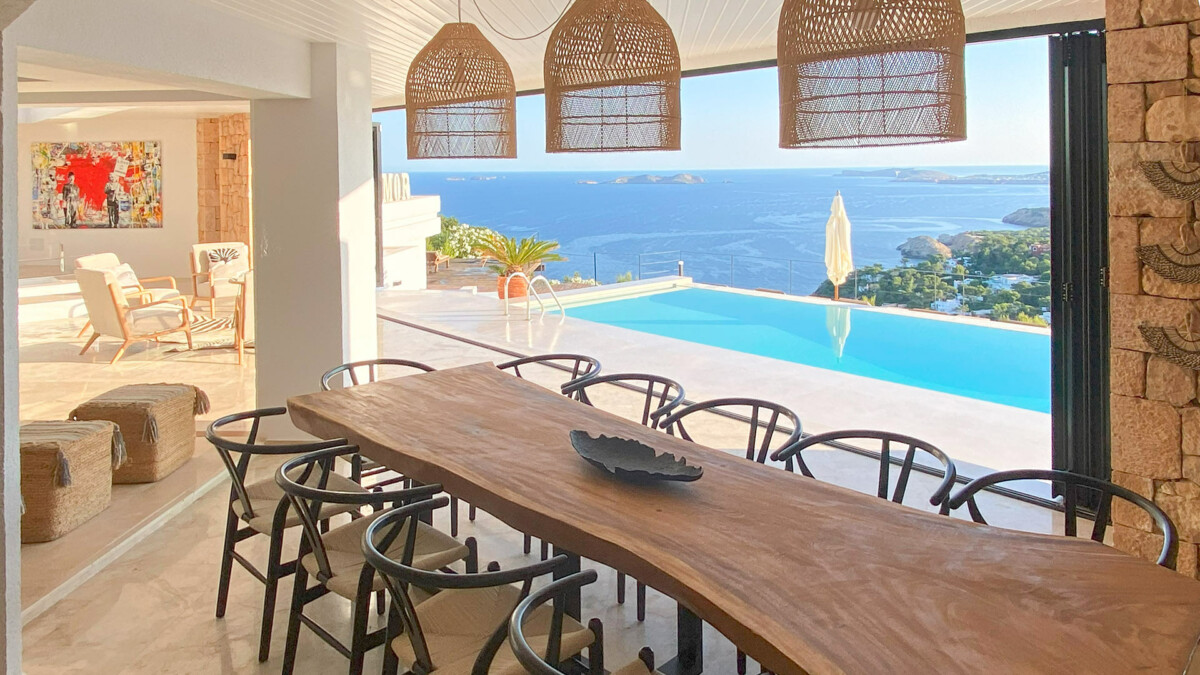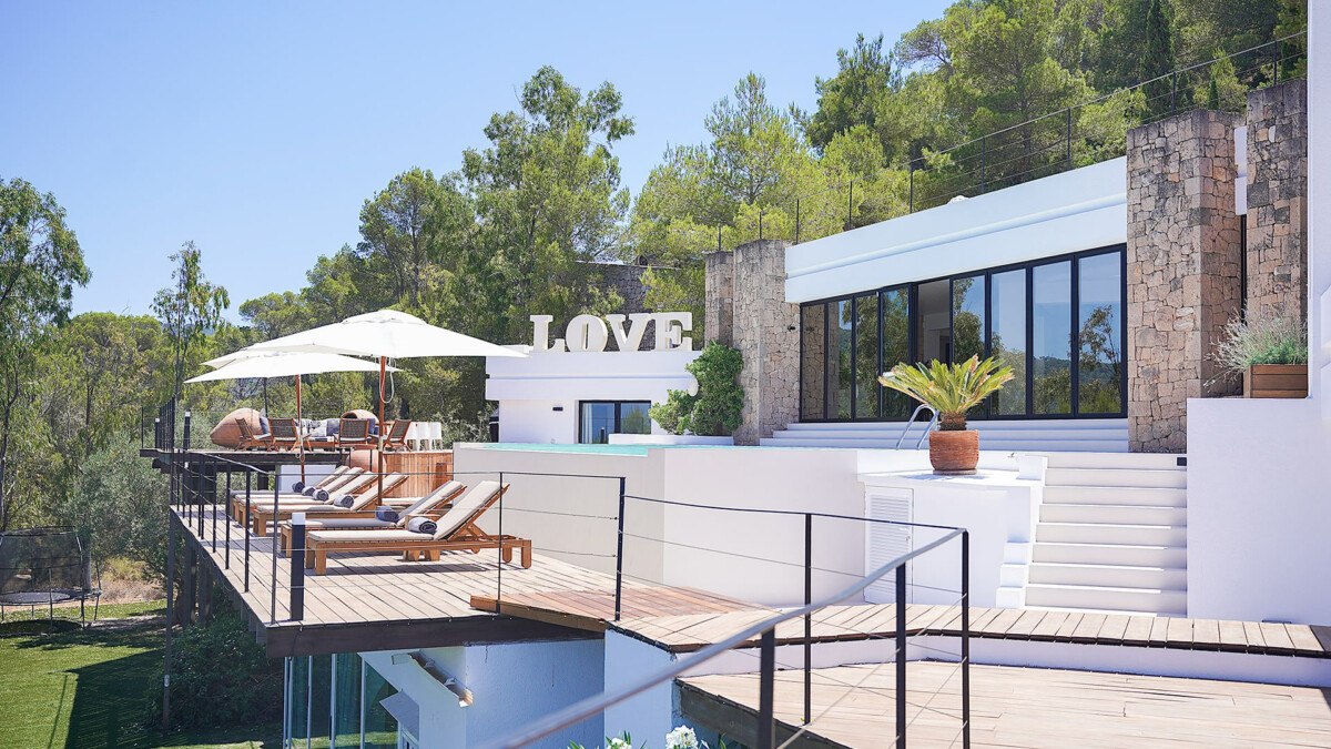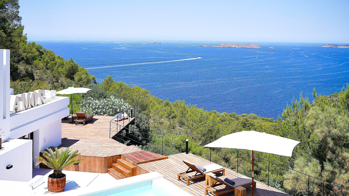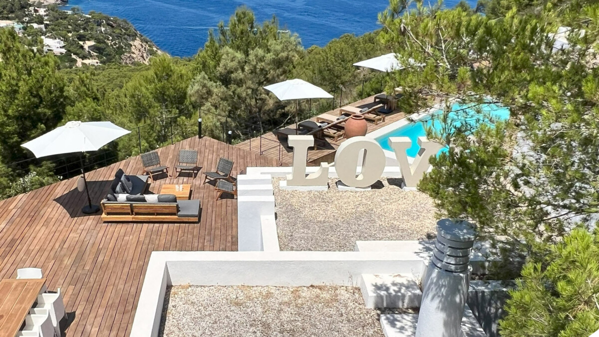 Cette résidence de vacances très privée, dotée d’un terrain de 10 000 m2, surplombe les plages de Cala Vadella et de Cala Carbó, sur la côte ouest d’Ibiza.
