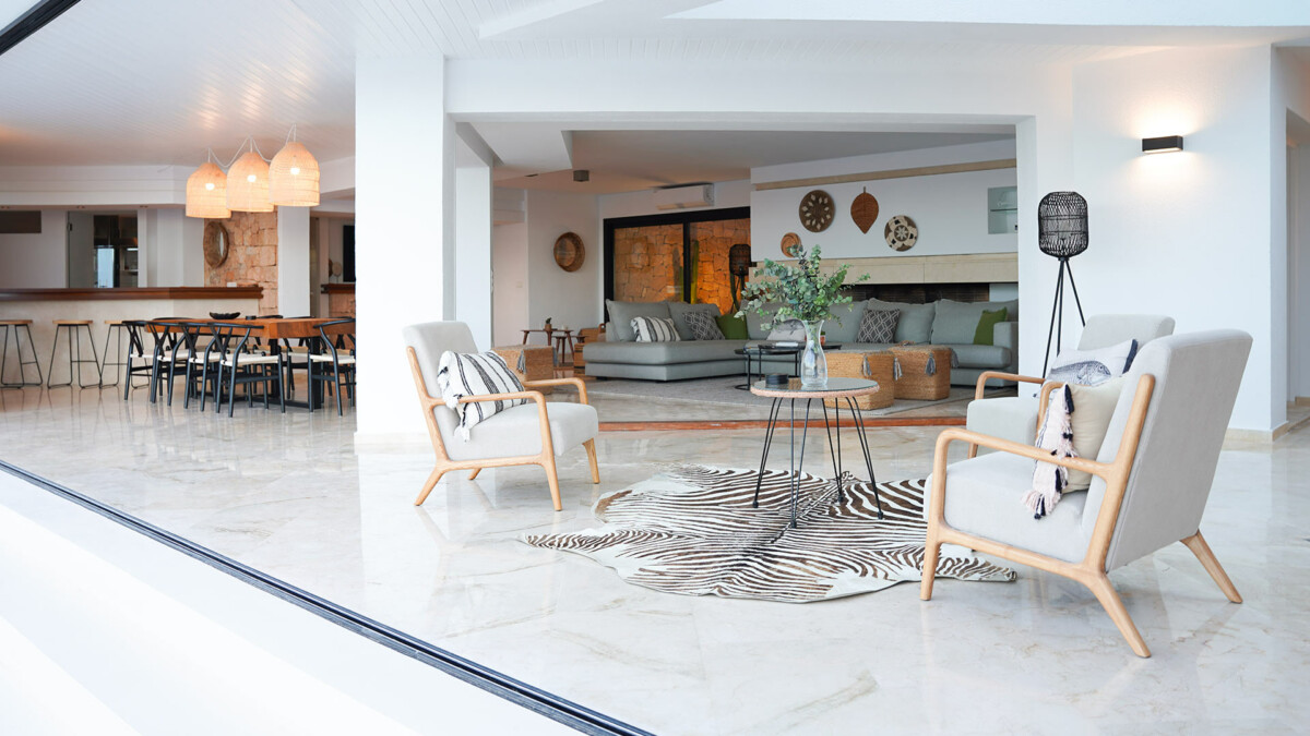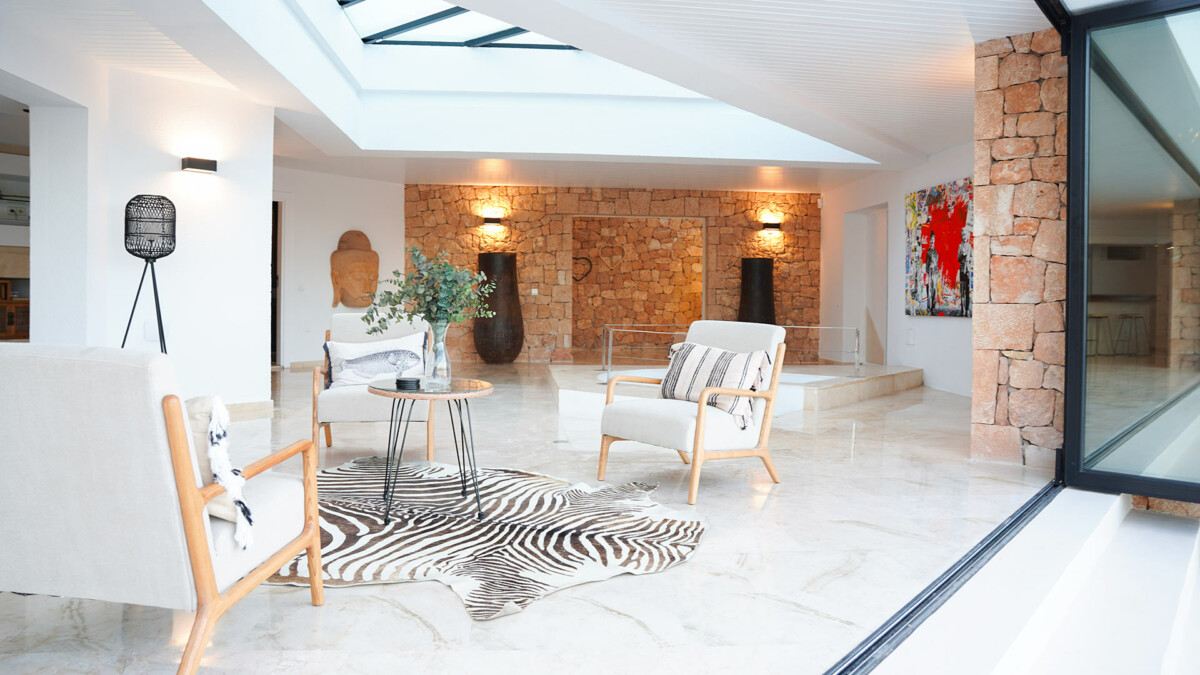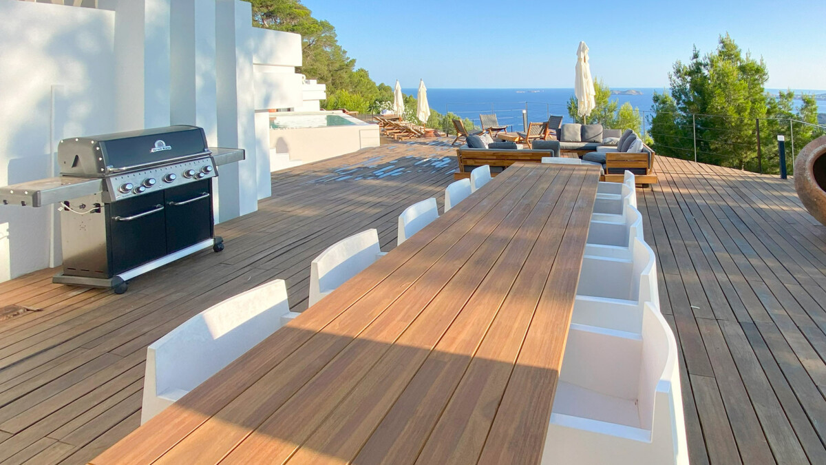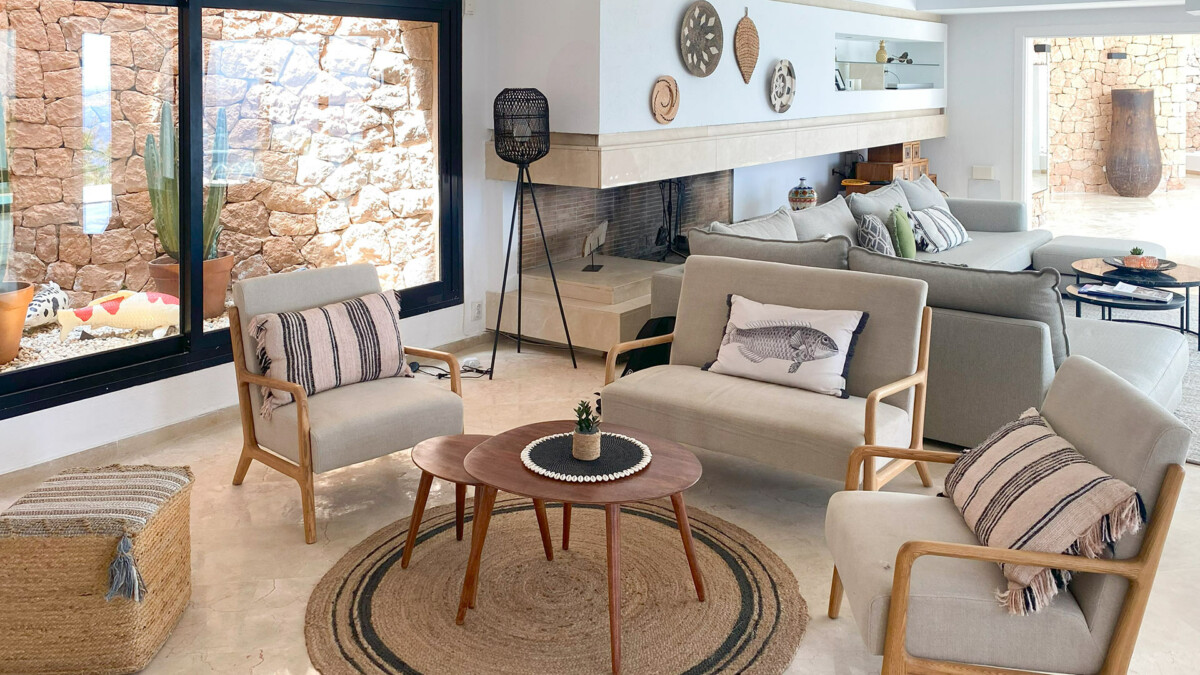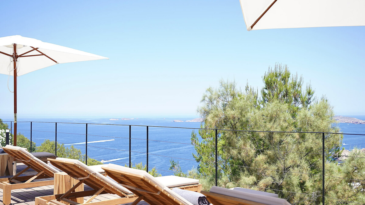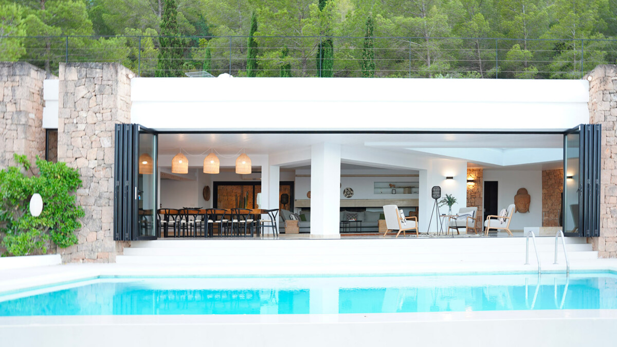Cette résidence de vacances très privée, dotée d’un terrain de 10 000 m2, surplombe les plages de Cala Vadella et de Cala Carbó, sur la côte ouest d’Ibiza.