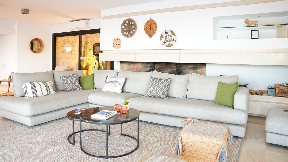 Le salon ouvert, doté d’une porte en verre, donne sur la piscine à débordement et le bleu de la mer Méditerranée.