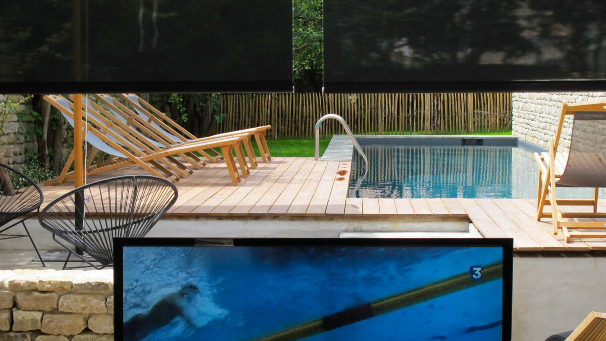 In the pavilion, on the ground floor, the TV room opens onto the swimming pool and a kitchenette to enjoy an aperitif at the edge of the water. Upstairs, overlooking the swimming pool, a bedroom with bathroom & WC and a bedroom with shower & toilet.