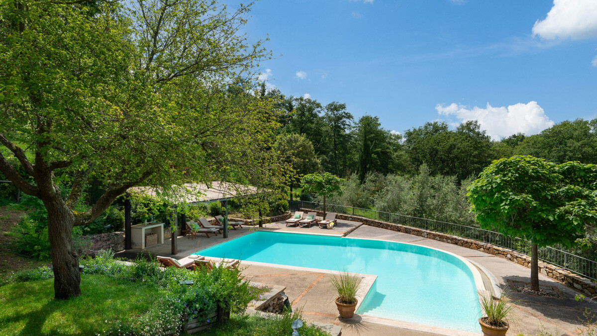 Un grand jardin clôturé d’environ 20 000 m2 avec plantes, fleurs et grands chênes centenaires entoure la villa et garantit intimité et tranquillité. Vous pourrez profiter des terrains de gymnastique ou de détente disséminés sous les grands chênes.