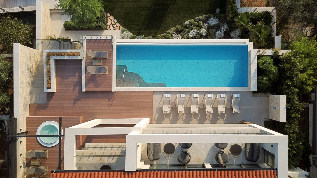 Entourés par une grande terrasse en bois, se trouve la piscine chauffée de 50m2 avec vue sur la mer et le jacuzzi pouvant accueillir 5 personnes.