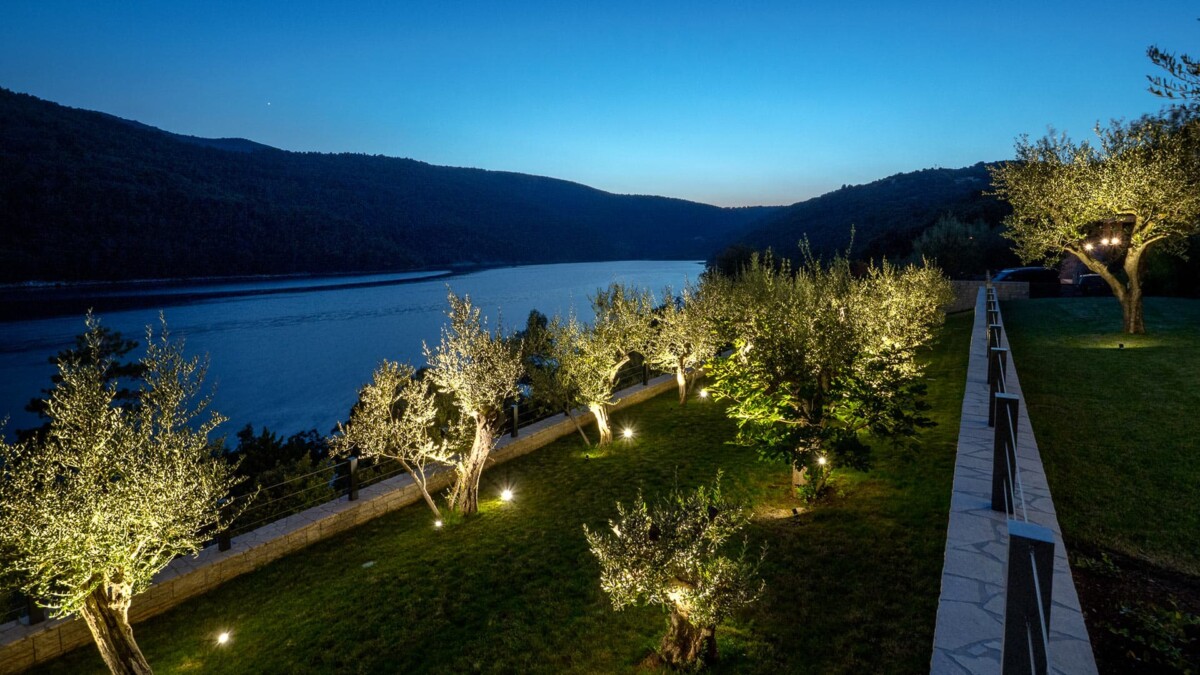 À la nuit tombée, vous pourrez admirer les illuminations de la villa et l’oliveraie éclairée avec vue sur la mer.