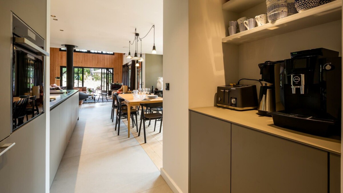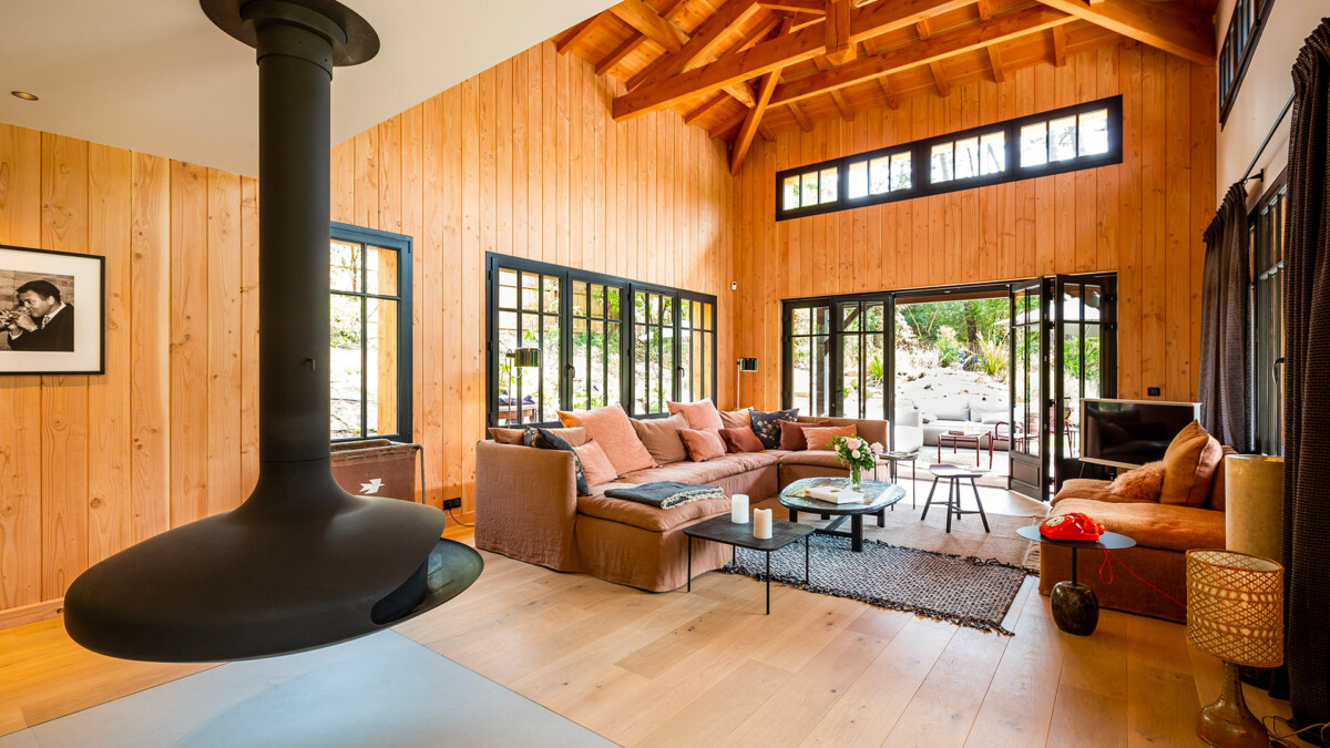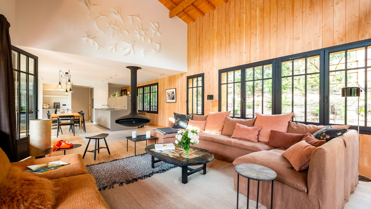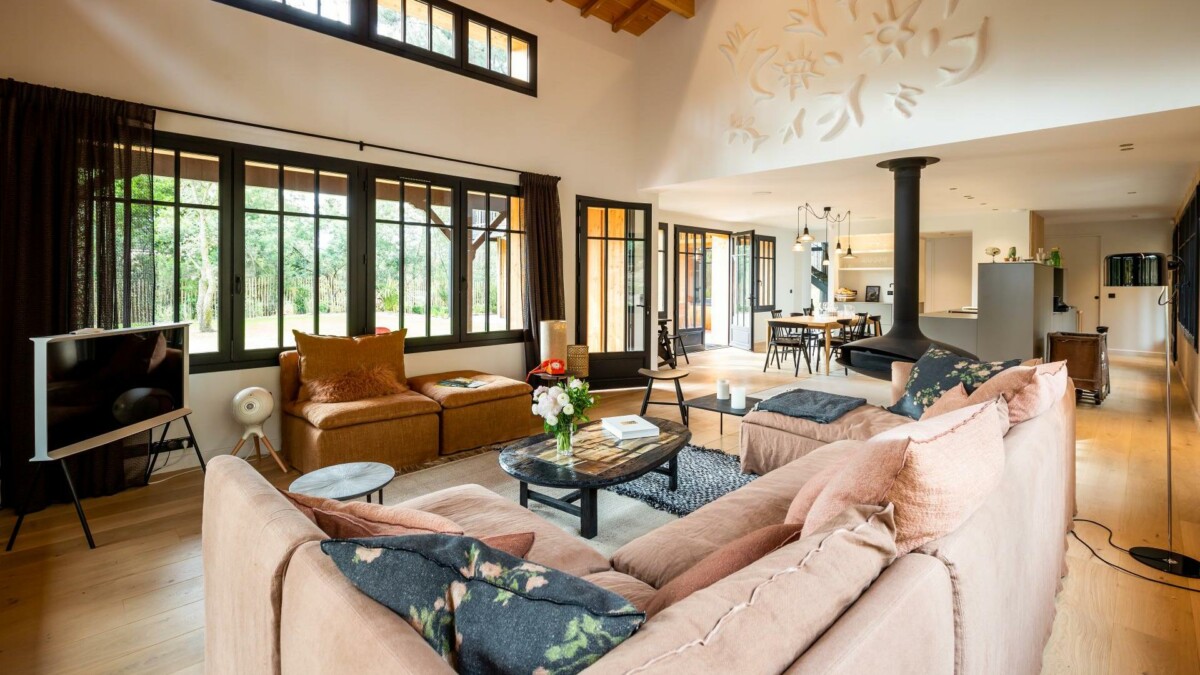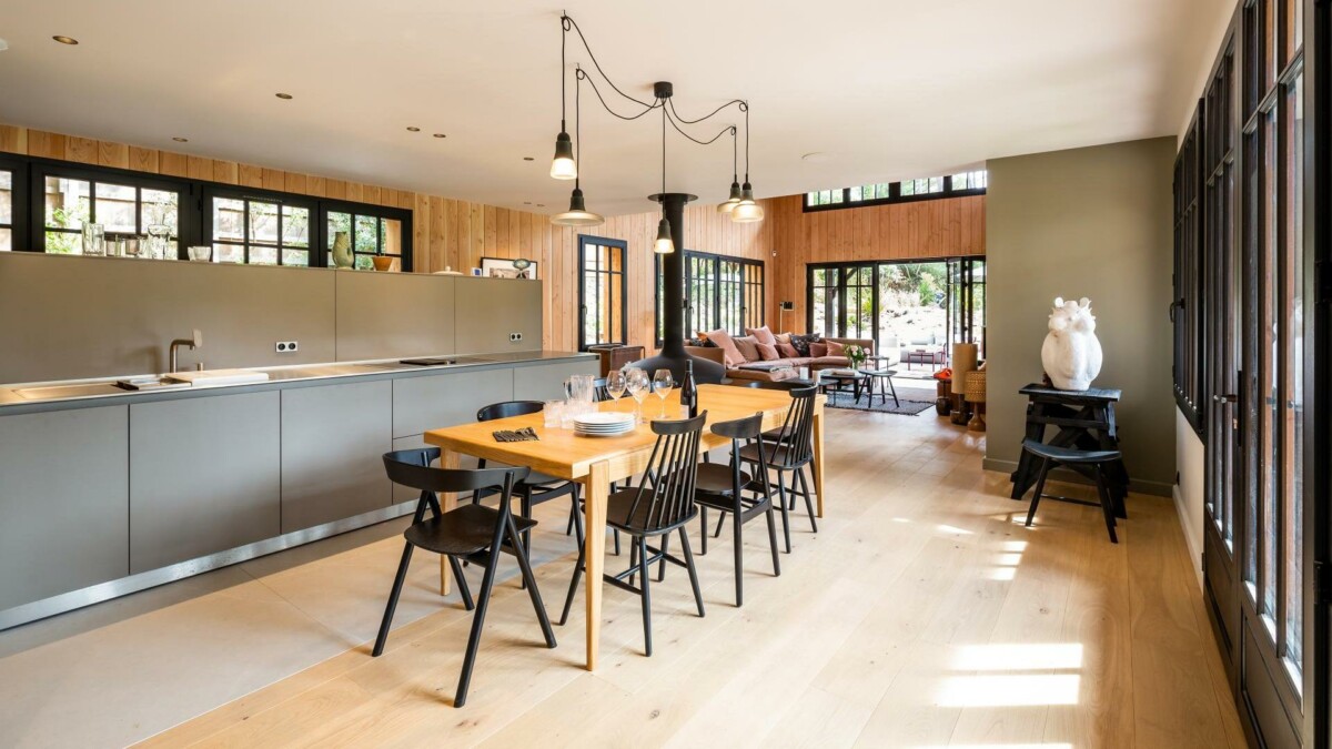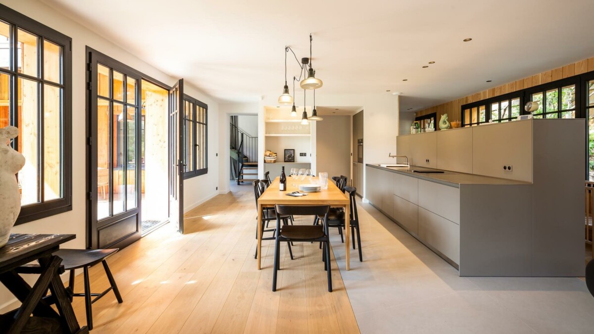Au rez-de-chaussée de la maison principale, un vaste espace de vie s’étend en une cuisine Bulthaup entièrement équipée, une salle à manger conviviale, et un salon confortable agrémenté d’une cheminée. Les larges baies vitrées laissent pénétrer la lumière naturelle et ouvrent sur l’extérieur. Le choix des matériaux et la palette de couleurs neutres confèrent à l’ensemble une ambiance apaisante.