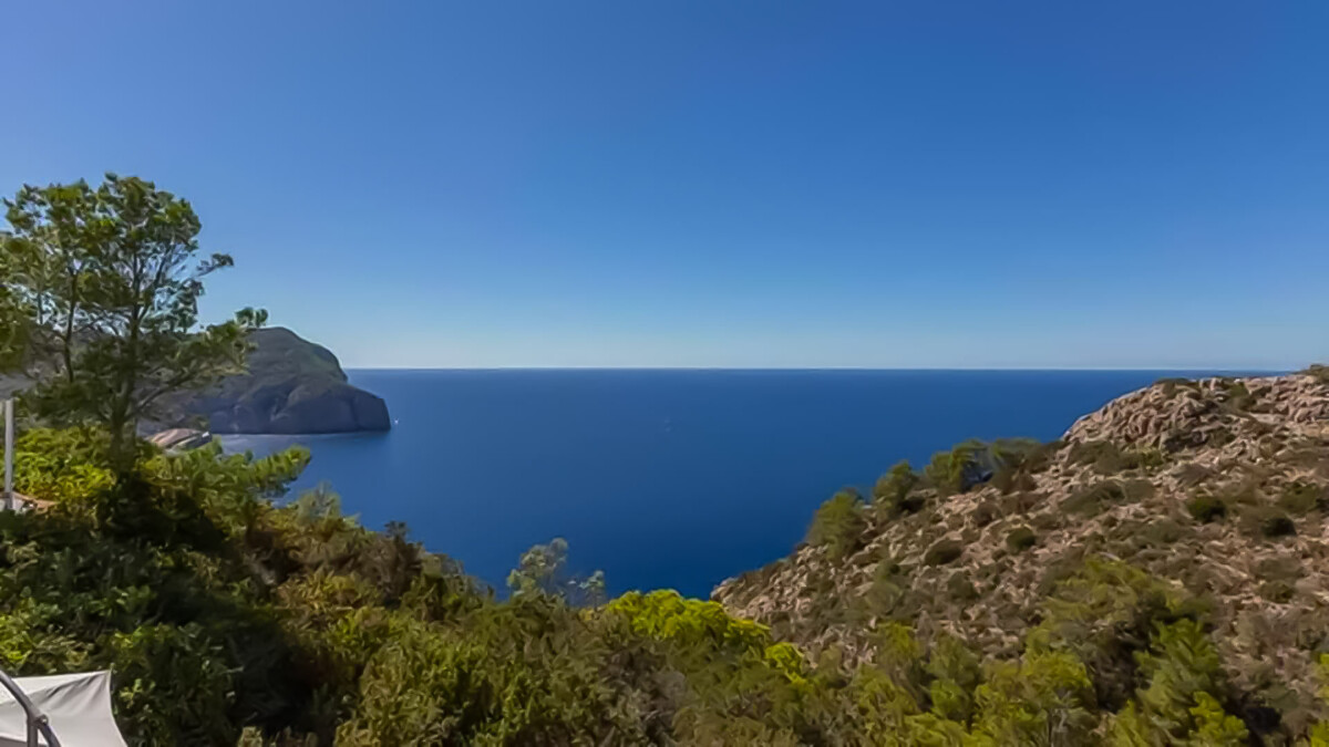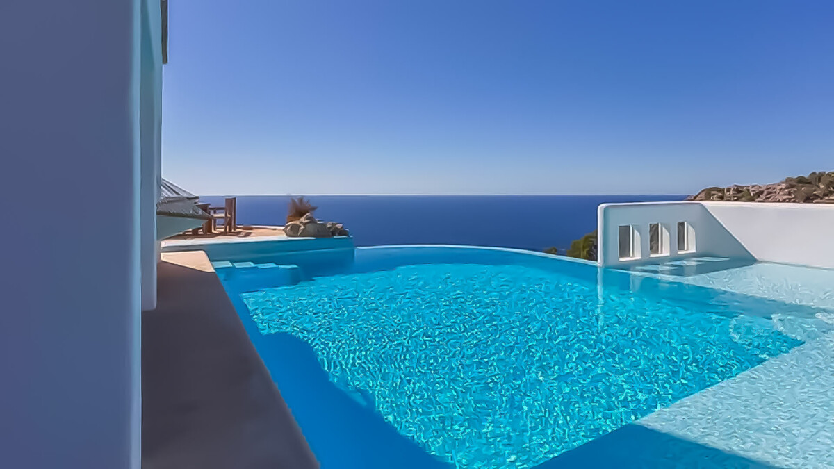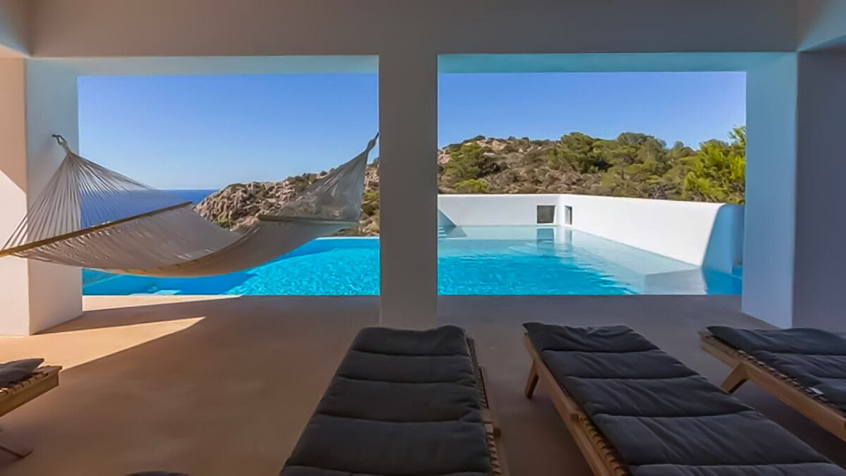 Terrasse avec des canapés et des coussins confortables à côté de la piscine avec une vue imprenable sur les montagnes et la mer.